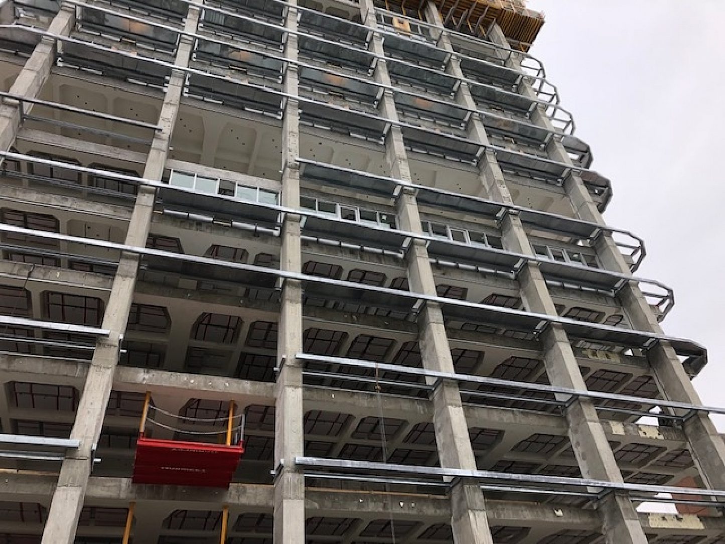 Structural steel and plates that support the the double-skin exterior, the penthouse floor and solar roof supports.