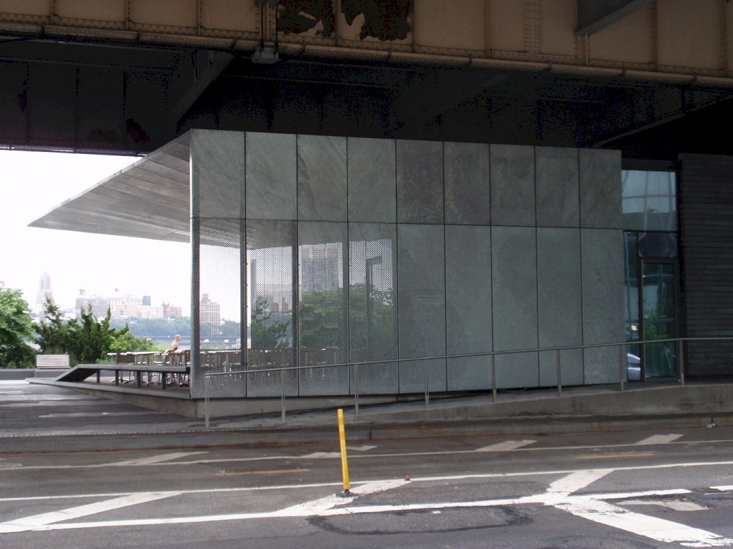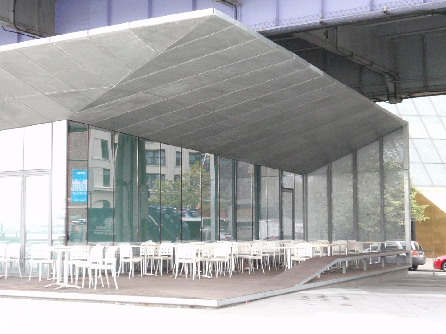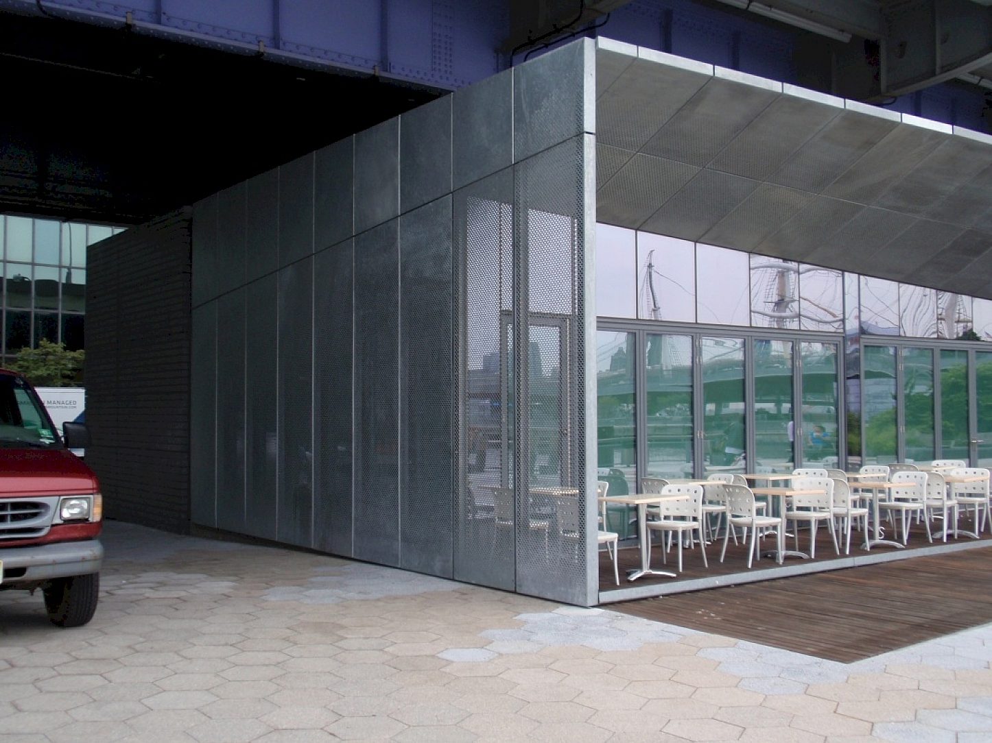 Maiden Lane Pavilion is located on Pier 15 on the East River Waterfront in New York City, New York where the building is constanly sprayed by salt water from the East River. The Department of Parks and Recreation wanted the soffit and side panels to be free of rust and maintenance for many years to come. In addition, the Architect wanted an industrial look to blend in with the FDR overpass directly above the pavilion. The main selling point for hot-dip galvanizing was the cost savings in material between stainless steel panels and hot-dip galvanized panels.