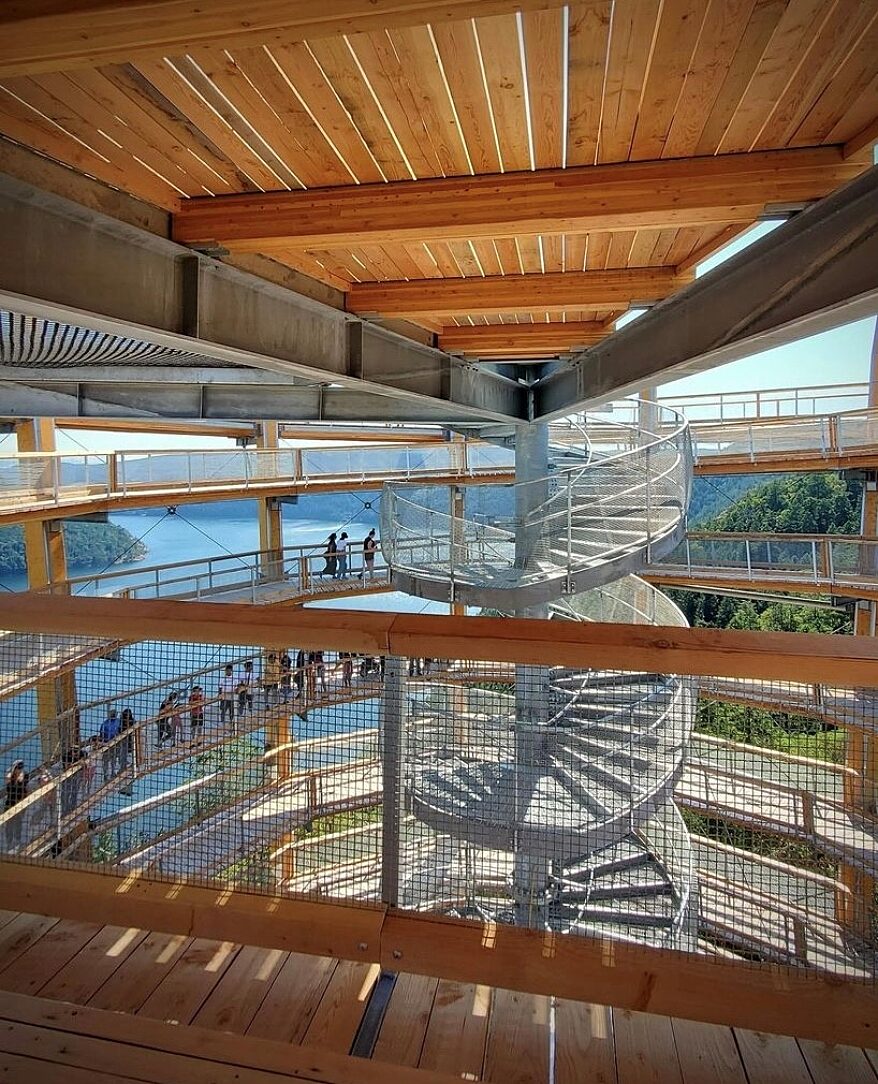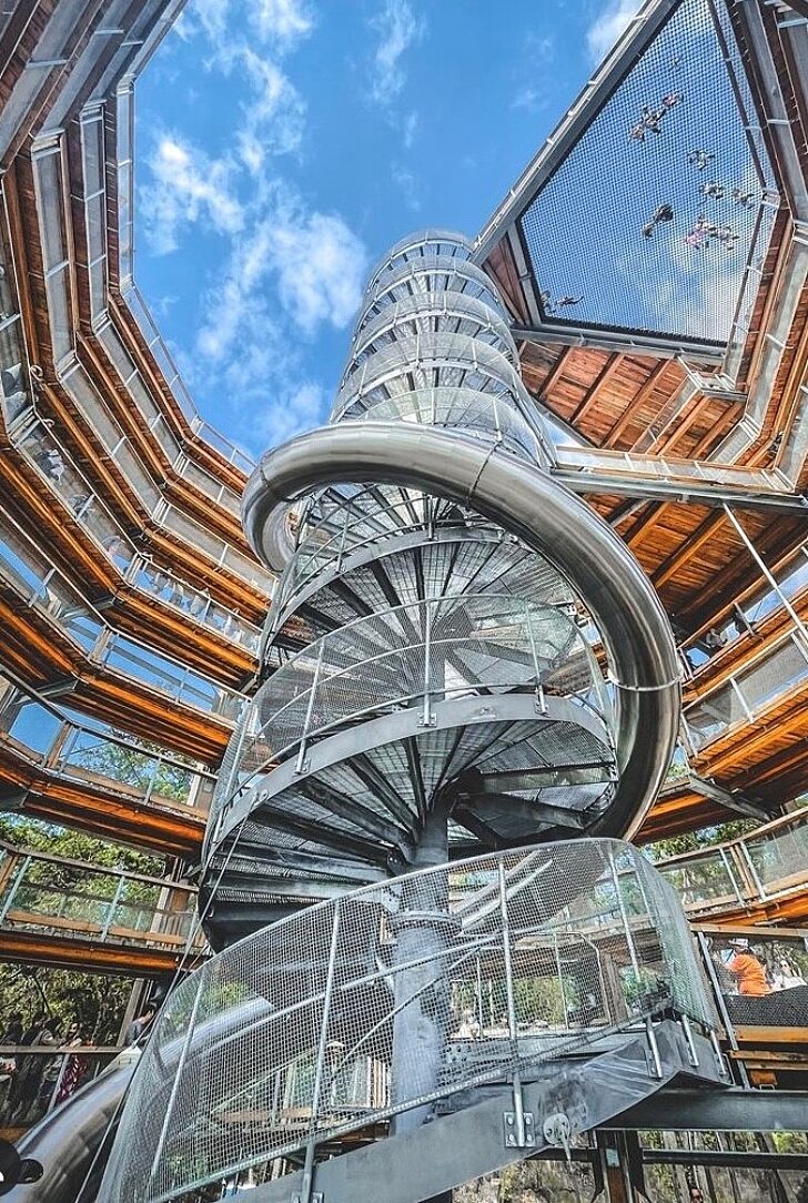 The primary structural system consists of glulam columns with hot-dip galvanized steel bracing all around the perimeter. Galvanized outriggers from these columns create a 600m-long spiral walkway transporting visitors to the top of the structure and access to the viewing platform. A galvanized steel central spiral staircase provides emergency egress.