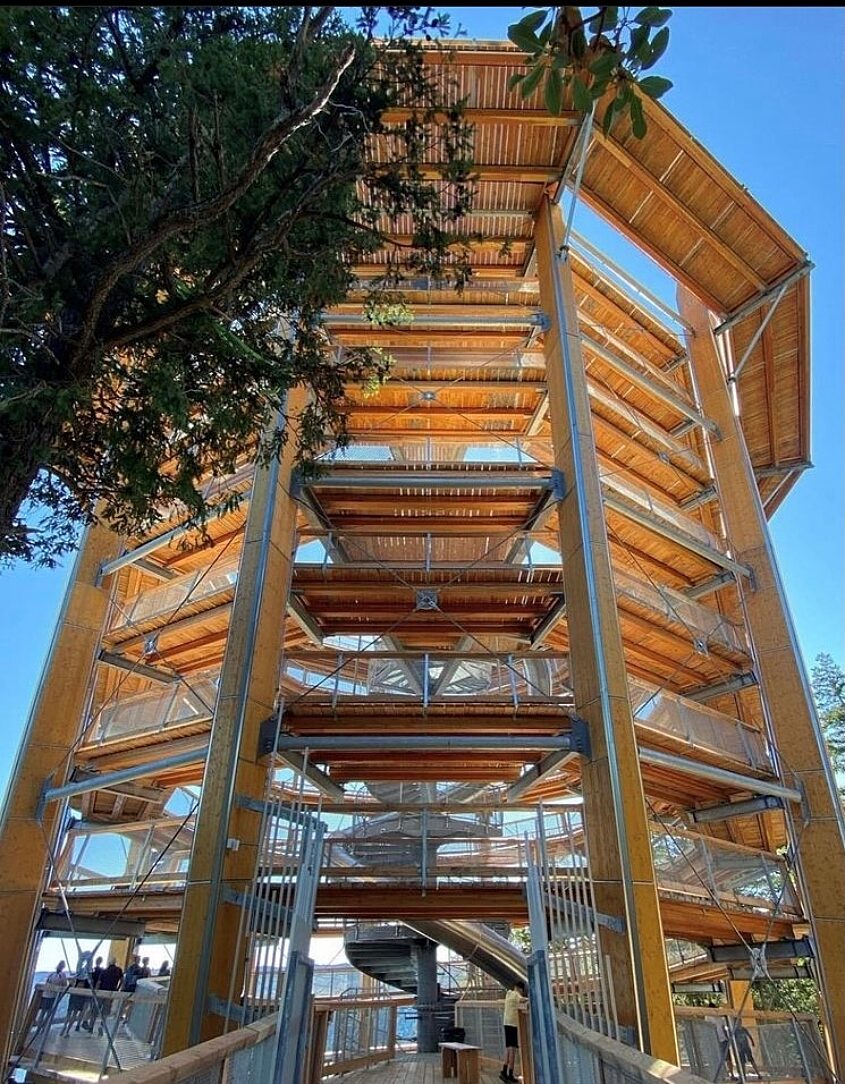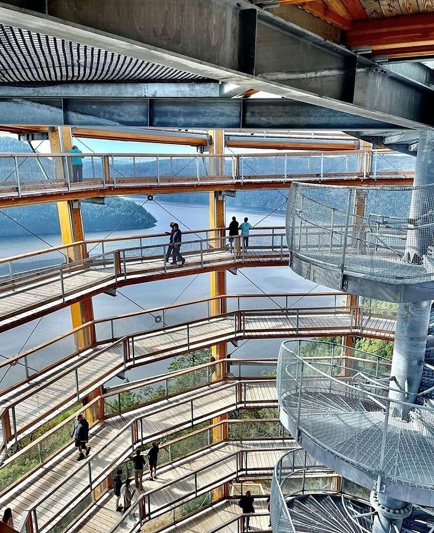 A 650m long galvanized and timber “treetop walk” leads visitors from the visitor center onto the hot-dip galvanized spiral ramp which takes you up 30m to a galvanized lookout platform. There you will enjoy stunning, 360-degree views of Finlayson Arm, Saanich Inlet and Peninsula, and the Gulf Islands of Canda, as well as the San Juan Islands and Mount Baker in the United States.