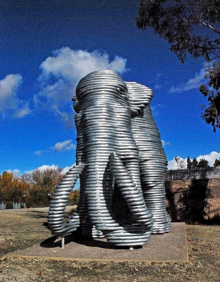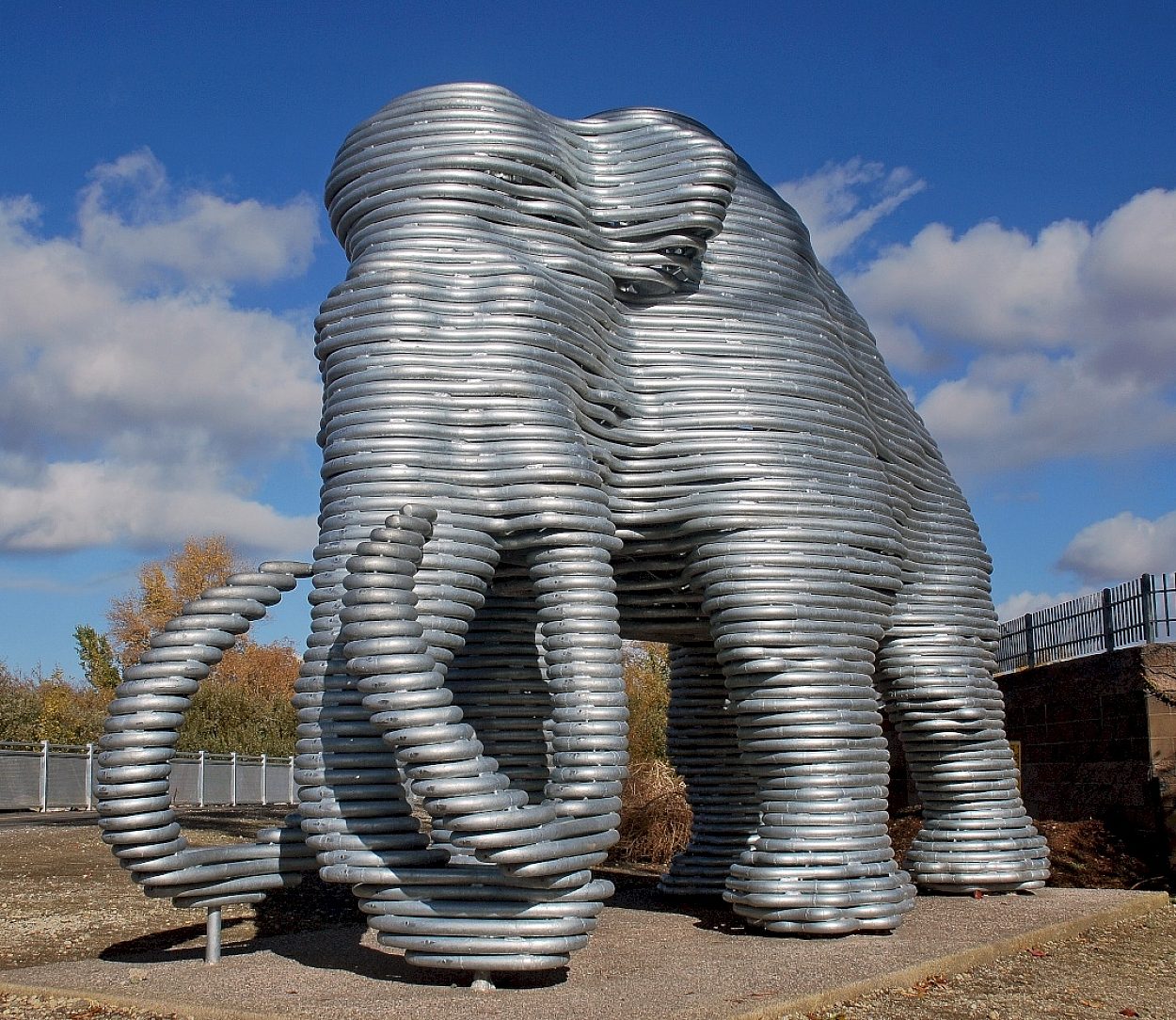 On a well-traveled trail head on the Guadalupe River in San Jose, CA stands a tribute to a long gone, but not forgotten mammal. A galvanized bent-pipe sculpture of an enormous adult mammoth, towering over 12 feet tall and 18 feet long weighing in at a massive five tons, it is truly a sight to behold.