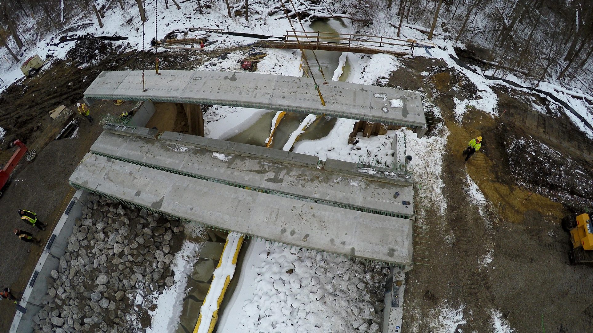 For this project, St. Clair County opted for the Accelerated Bridge Construction (ABC) design of the Con-Struct Bridge. In this design, the units are prefabricated with the final driving surface already attached. This meant the bridge would arrive in only a few sections that could be quickly and easily installed, saving a lot of time and money. The hot-dip galvanized steel tub girders, combined with the precompressed concrete bridge deck creates one of the longest lasting bridges available; meaning, St. Clair County is setting up future generations for success with less required maintenance and a longer service life.