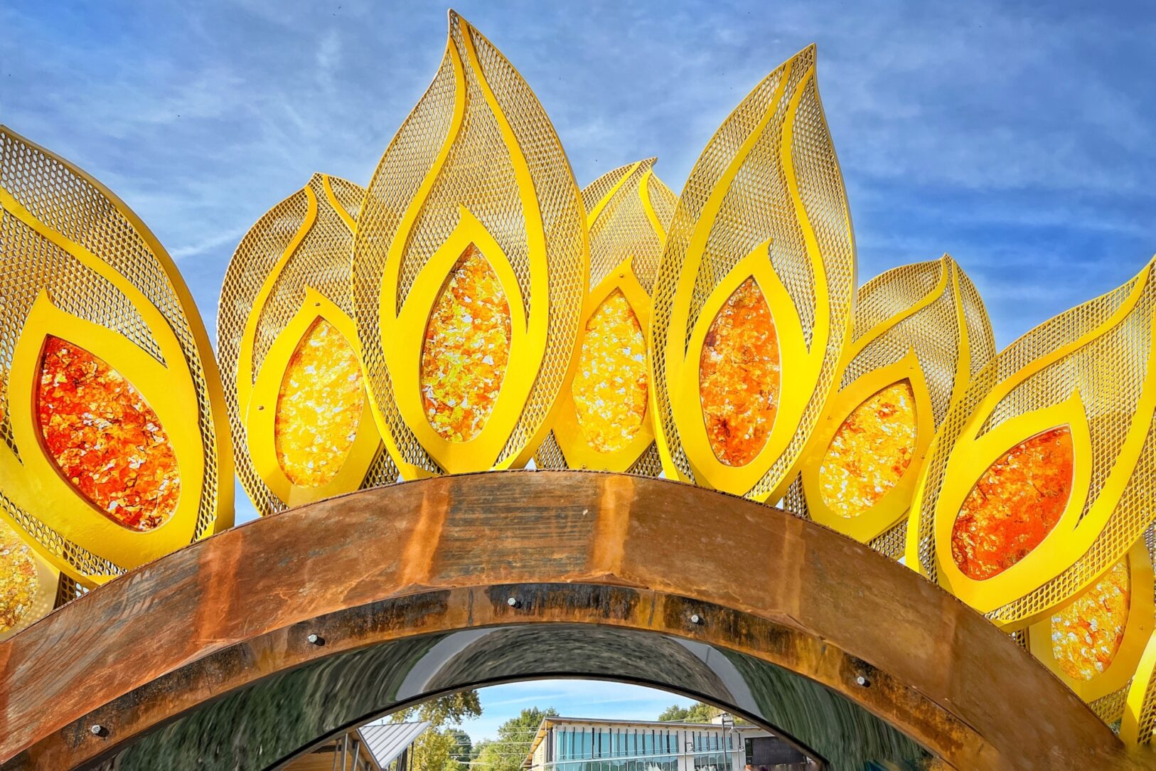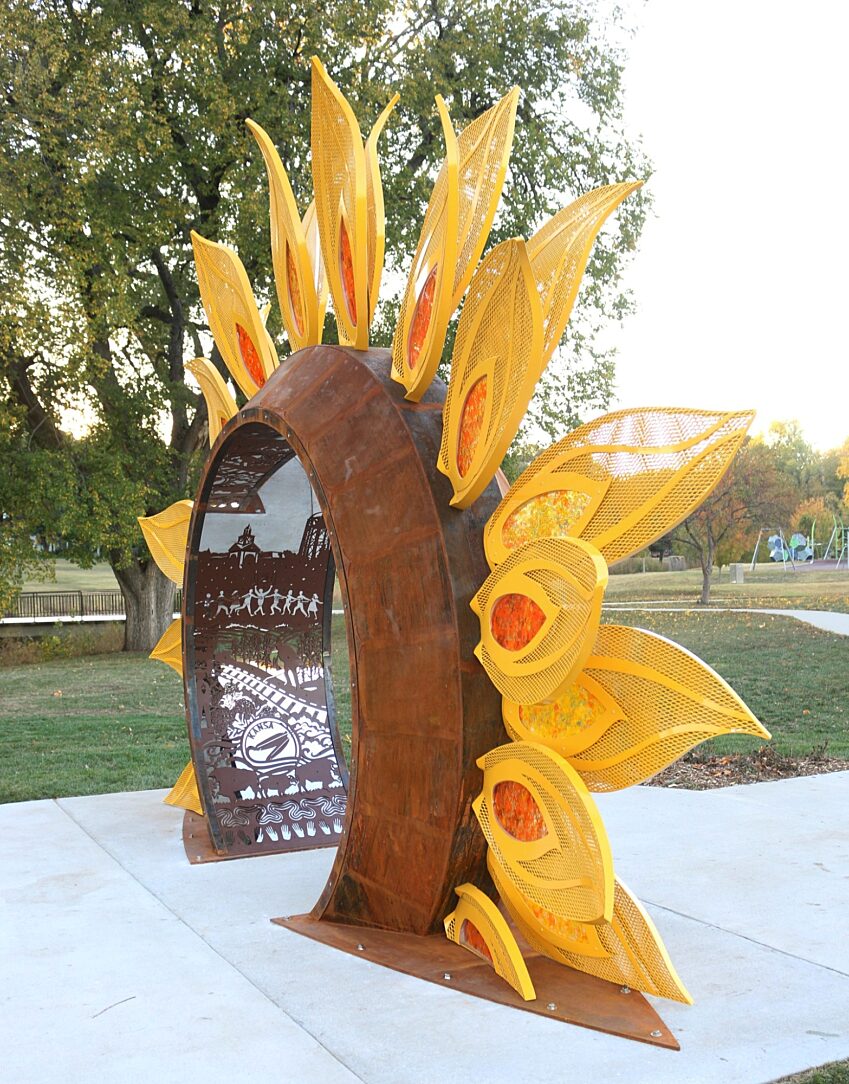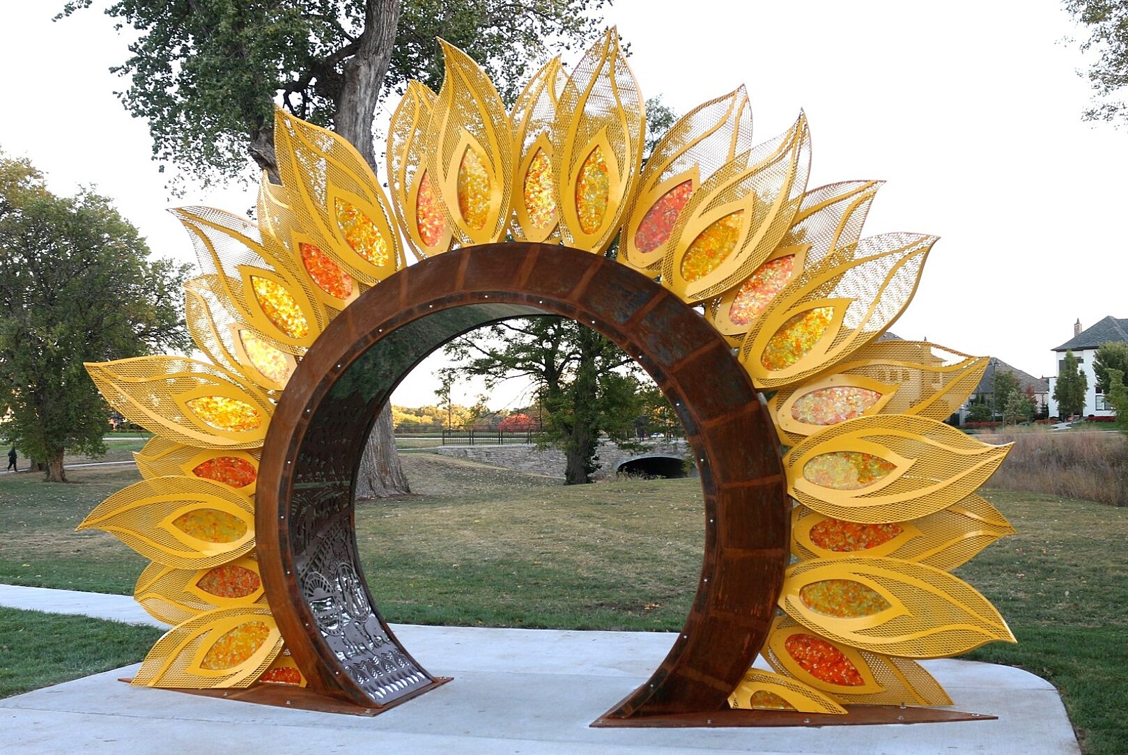 Aime had an interest in working with metal, so she reached out to a local welding shop and started learning how to weld and work with metal, using stainless and carbon steel. She started doing pieces for businesses around the Kansas City Metro area. When the bid for Meadowbrook Park became available to submit design on, she imagined a sunflower that lights up at night. She was bidding against artists from New York and Italy. Now her design is a pathway to a park for children to enter through.