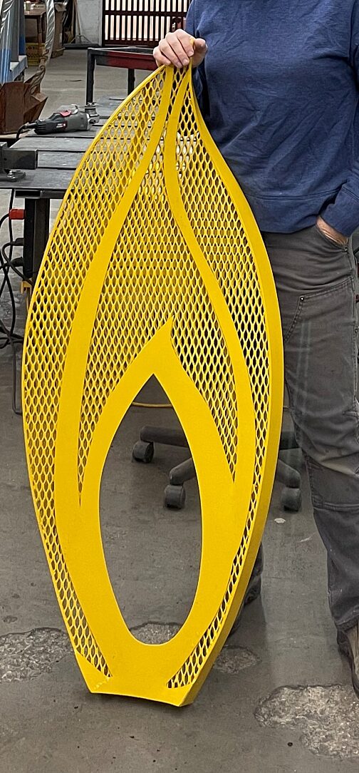 Each petal is cut and welded by hand. The piece is a duplex system which will give the sunflower years of maintenance free finish that will last for generations of children visiting the park. Each petal was mounted to an inner ring then electricity ran to each petal so they would light up at night. She is currently working on her next piece that will be outside of Castle Rock, CO.