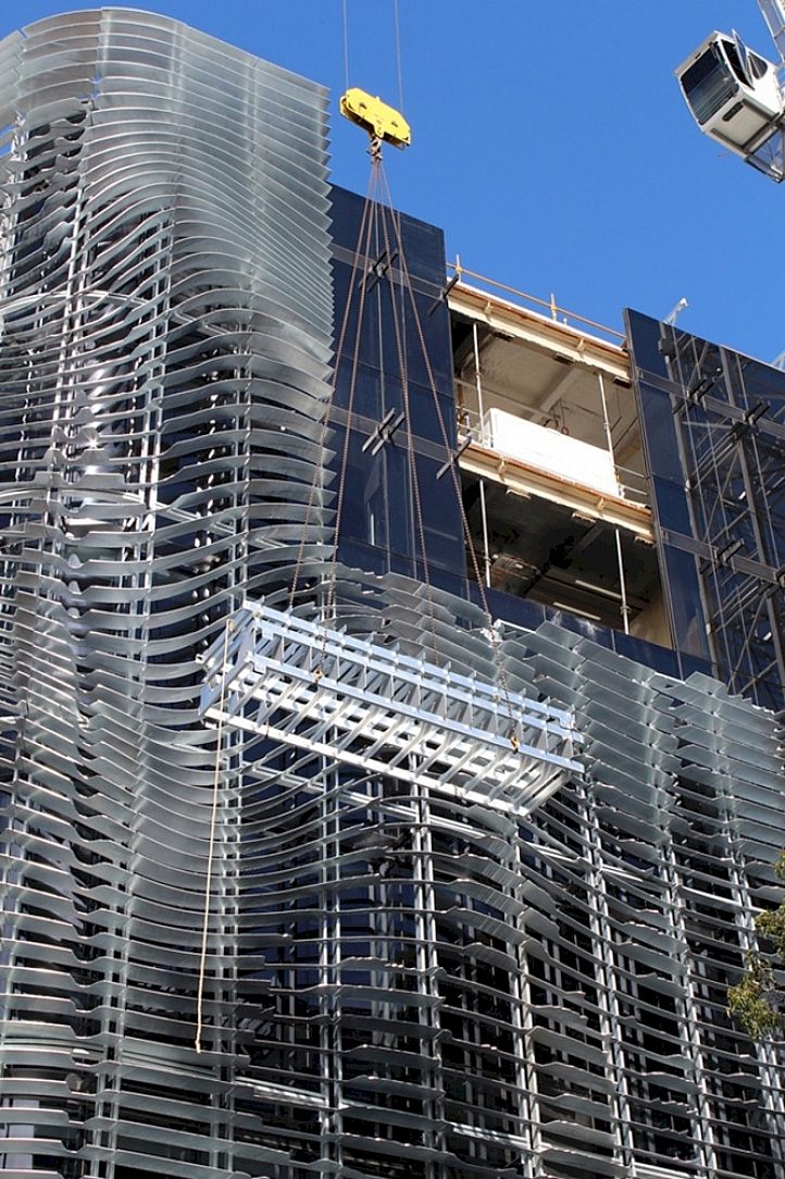 The steel sections of each louver have been shaped so that they form part of a series of 3D images that can be viewed from different angles as people walk around the building and look on from nearby buildings.