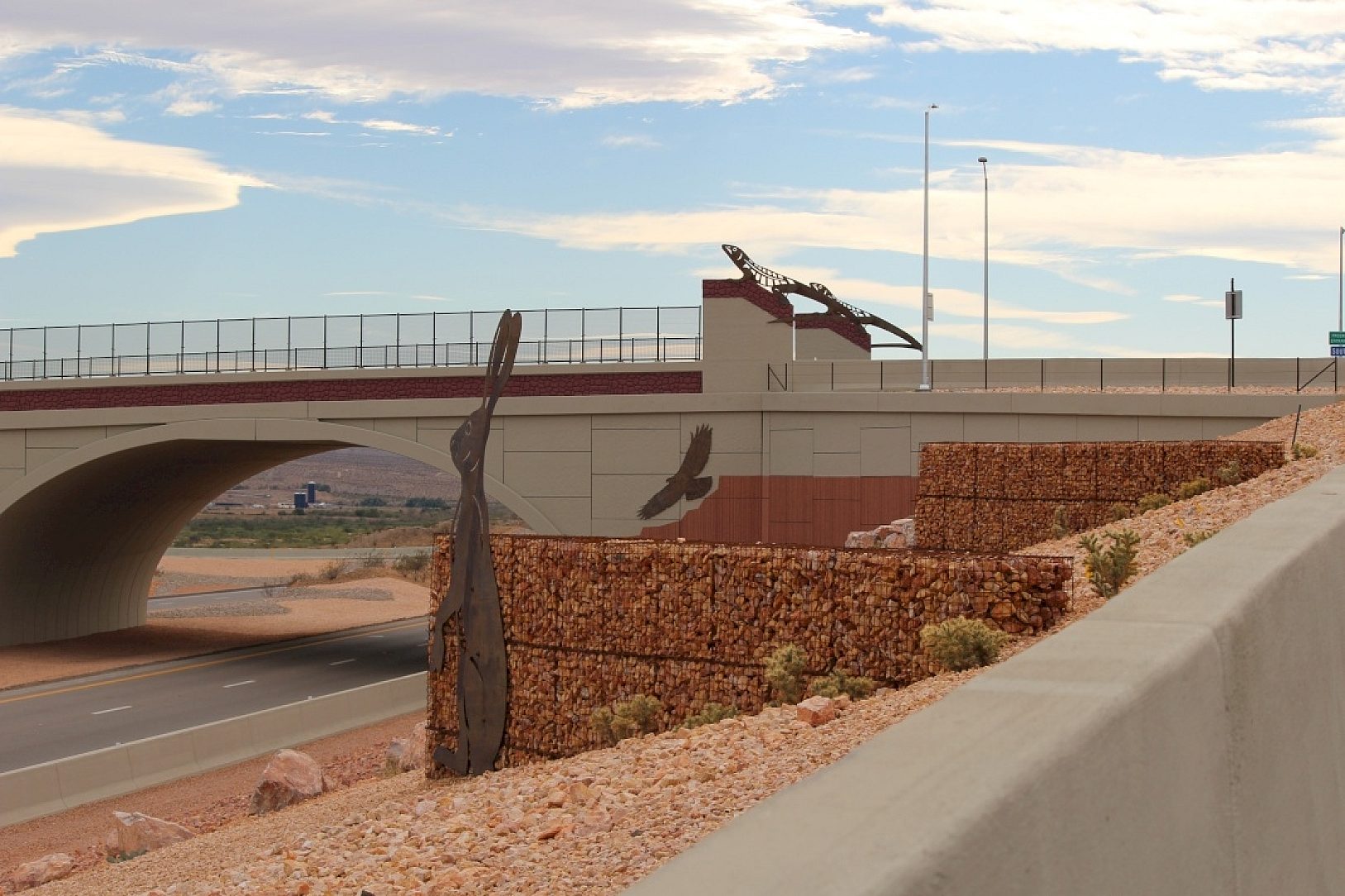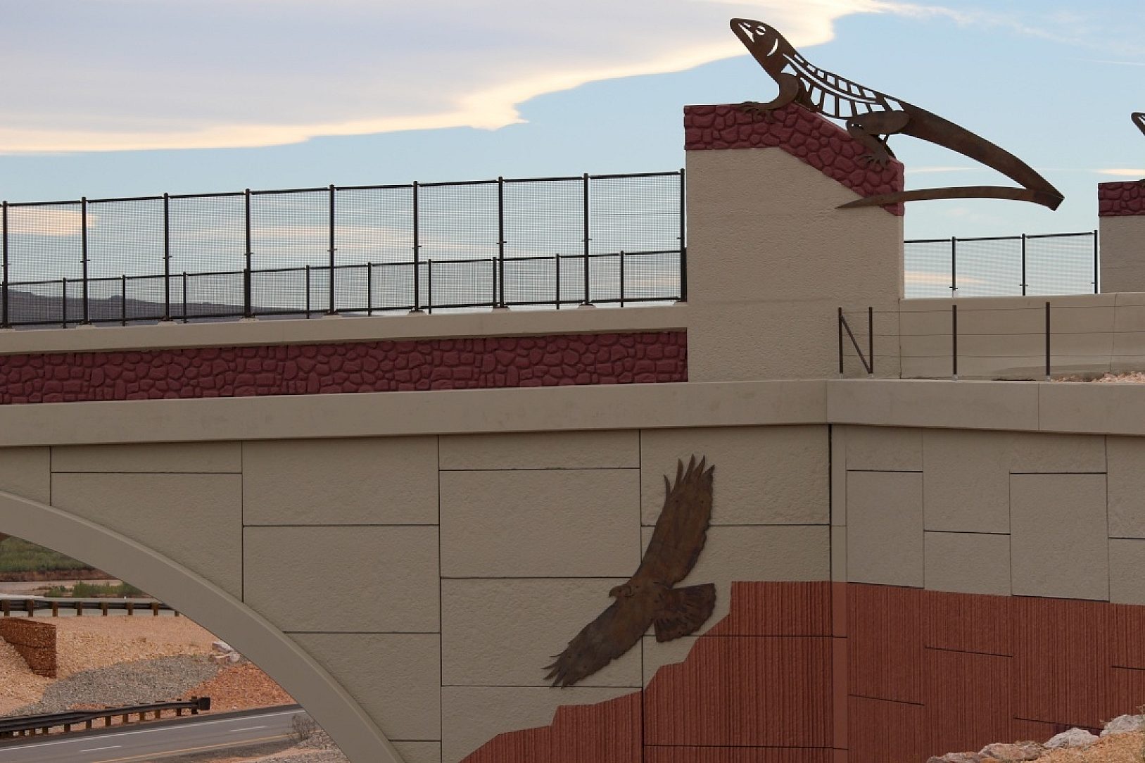 This new arched bridge that serves as a gateway to Mesquite, Nevada is one of a kind along the I-15 interstate stretching from California in the south, to Montana in the north. The bridge is approximately the halfway point from Los Angeles and Salt Lake City. To give the unique bridge an even more aesthetic appeal, the roadway was adorned with wildlife art commonly found in the Nevada desert. Jackrabbits, Red-tailed hawks and Long-tailed brush lizards were fabricated from steel and strategically placed atop the overpass and support walls on each side.