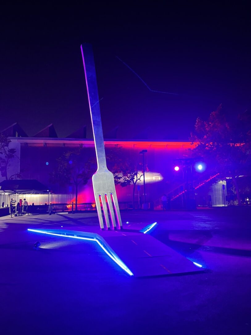 Metafork in the road is a whimsical 30-foot tall and 4,500 lbs. steel installation representing the classic metaphor for a deciding moment in life when a choice between presented options is required.
