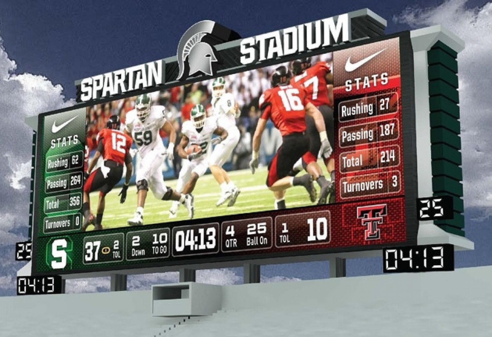The fifth largest video scoreboard in the country is the centerpiece in the south end zone. The LED portion of the board alone is 47 feet high and 114 feet wide, and comes in at an amazing 5,359 square feet. The two video boards in the north end zone of Spartan Stadium combine to feature 1,600 square feet of LED space. The north rim of Spartan Stadium also features a fascia ring atop the entire north end zone wall with another 4,510 square feet of video space.