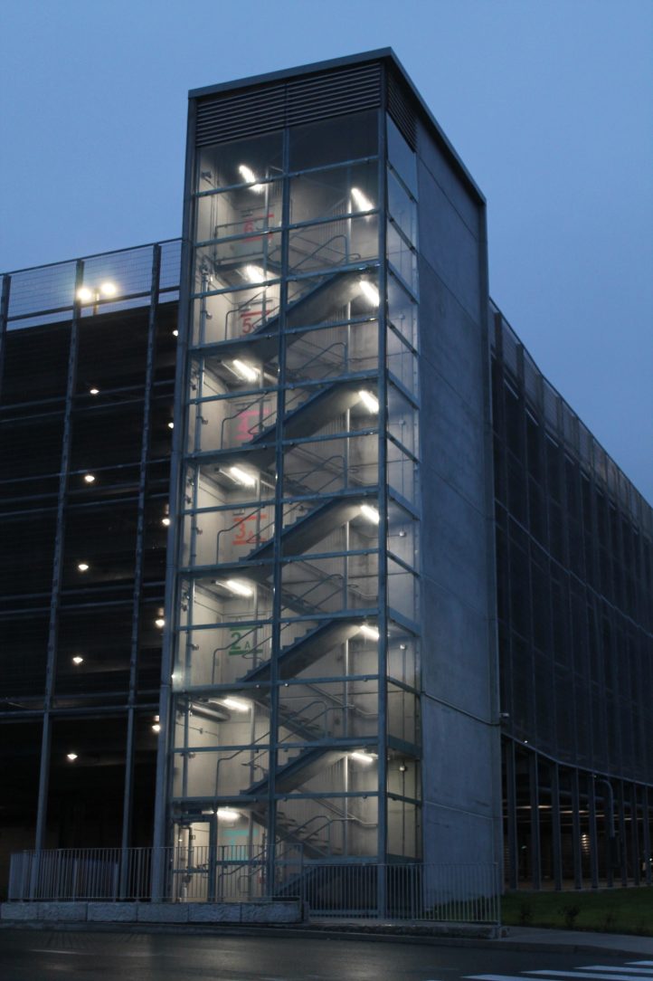 This P3 1,010-stall parking structure was to include a gross floor area of 297,116.22 sq. ft. two stair towers, two elevators with heated and tiled vestibules. This structure also included the installation of 5 EV chargers, with the option of a future expansion of 20 EV chargers, bike storage, and state-of-the-art web automation garage control. This automation allows the owners to monitor heating, electricity, lighting, sprinkler and fire alarm systems remotely.