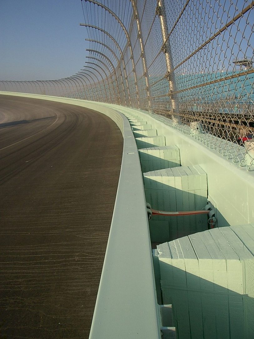 For many years, containment of errant racing vehicles traveling on oval speedways was provided through rigid, concrete walls placed around the exterior and interior of the track. However, accident experience found that serious injuries and fatalities occurred through vehicular impacts into these non-deformable barriers. Because of these injuries, INDYCAR and the Indianapolis Motor Speedway, later joined by NASCAR, sponsored the development of a new barrier system by the Midwest Roadside Safety Facility at the University of Nebraska-Lincoln to improve the safety of drivers participating in automobile racing events.