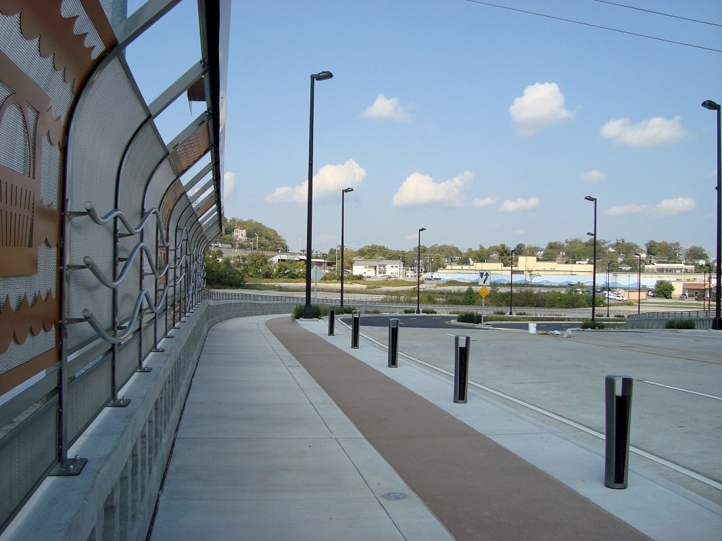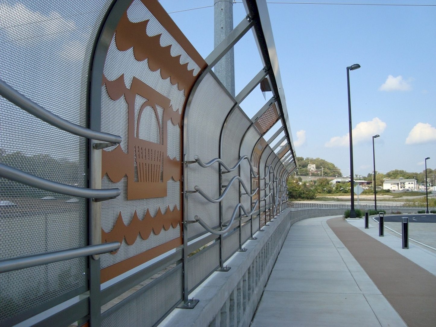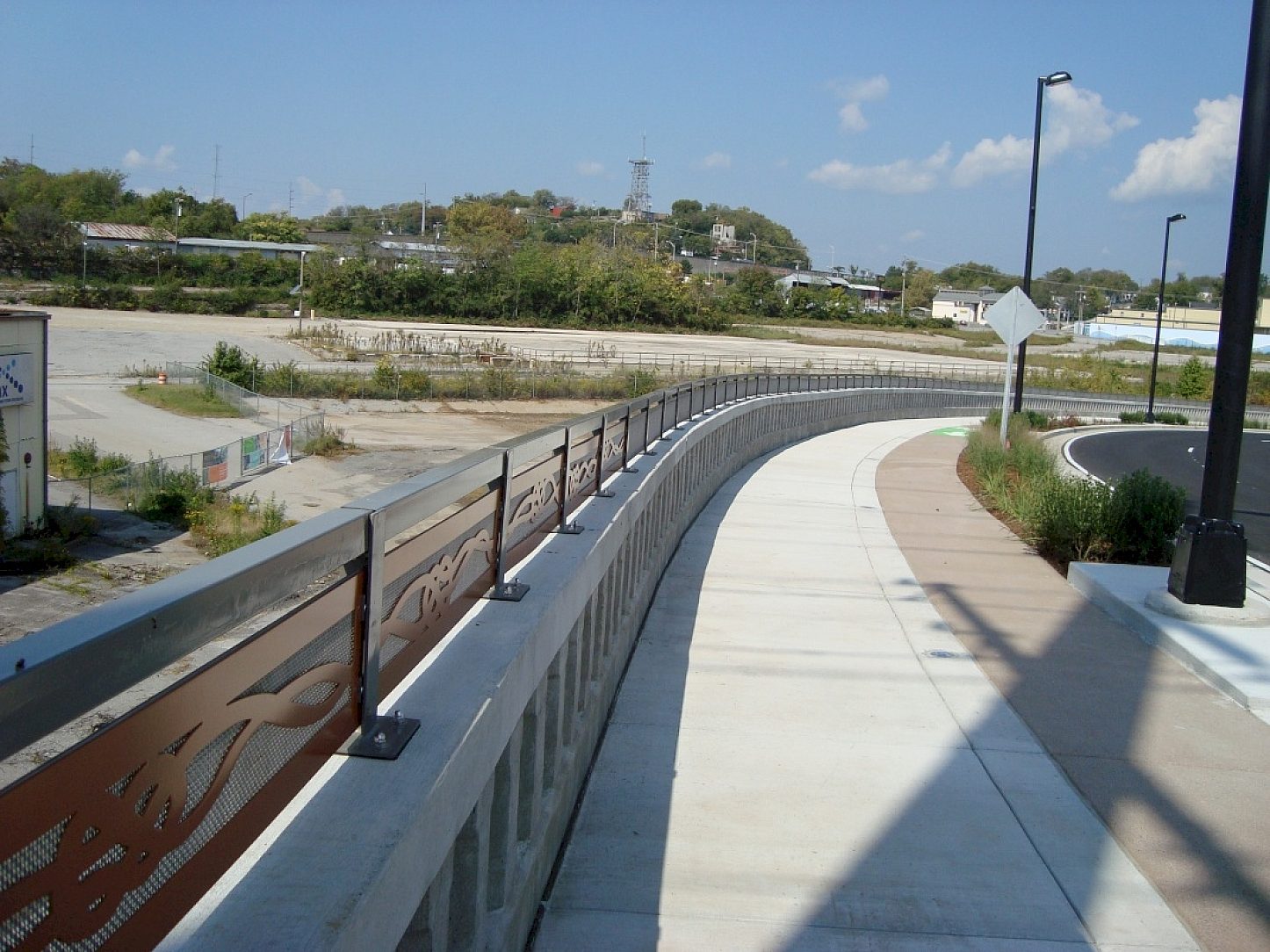 Some 20 years in the making and only 0.3 miles in length, the project was completed at a cost of $18 million. The railroad bridge is the signature piece of the Connector. The road features green space, pedestrian and bike paths, and public art.
