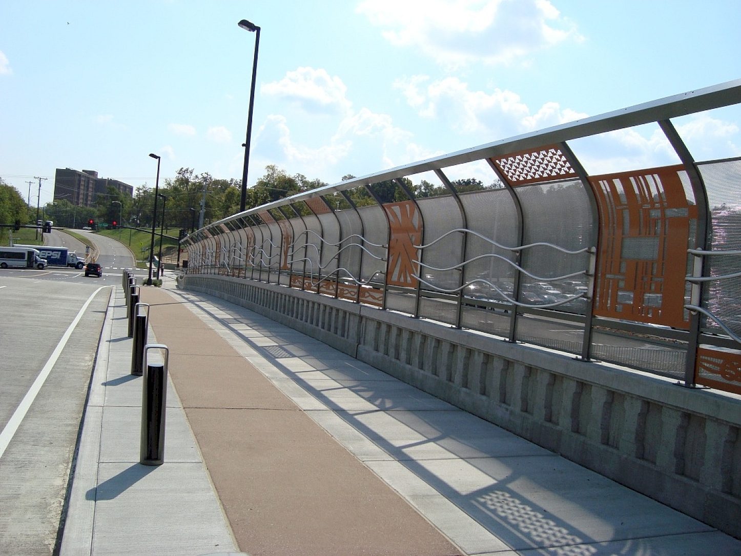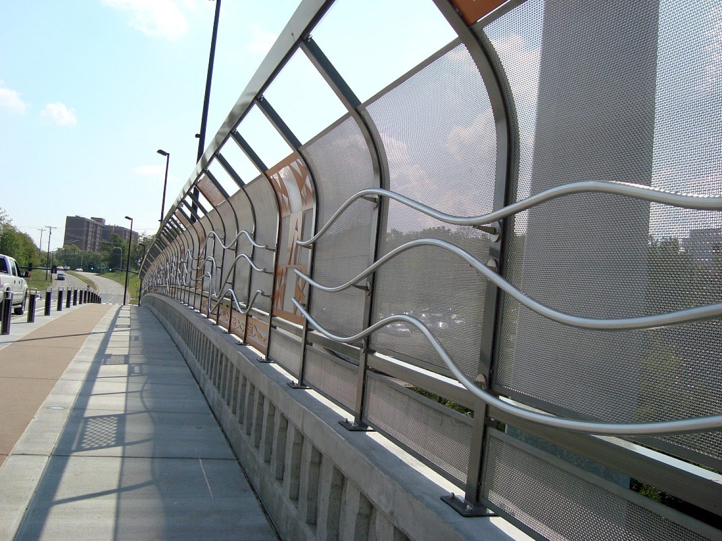 In order to protect the railings of the roadway, the contractor specified hot-dip galvanized posts and tubing with a polyester powder coat finish. Approximately 150 pieces of large T-posts with 2x4 connection tubing are being used on the bridge to protect pedestrians along the sidewalk. Providing a short top rail on the concrete side barriers is approximately 350 small T-posts with 2x2 connection tubing. To create a nice finished look, the designer elected to use stainless steel decorative screens and railings. Approximately 20,000 pounds of galvanized steel went into the railings.