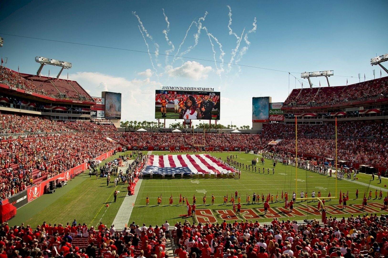 Whether the Buccaneers win or lose, the new massive state of the art, latest LED technology video display boards are a winner. Supported by hot dip galvanized steel, the two boards will withstand many years of cannon blasts. Each board is 60 feet high by 160 feet wide, displaying 9,600 square feet of high definition viewing screen. Accompanying the end zone video-boards are four 61 feet high by 43 feet wide towers for 2,304 square feet of multi-media video display panels. The total LED video display screens add up to 28,416 square feet, which is the third largest in professional football.