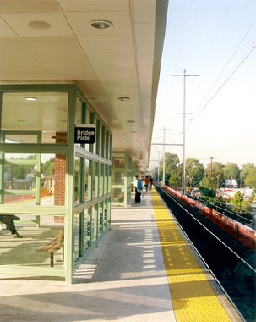 In this area of high public traffic, corrosion protection was necessary. Using a duplex system, all exposed steel (including railings, wind screens, and passenger shelters were galvanized and then painted.