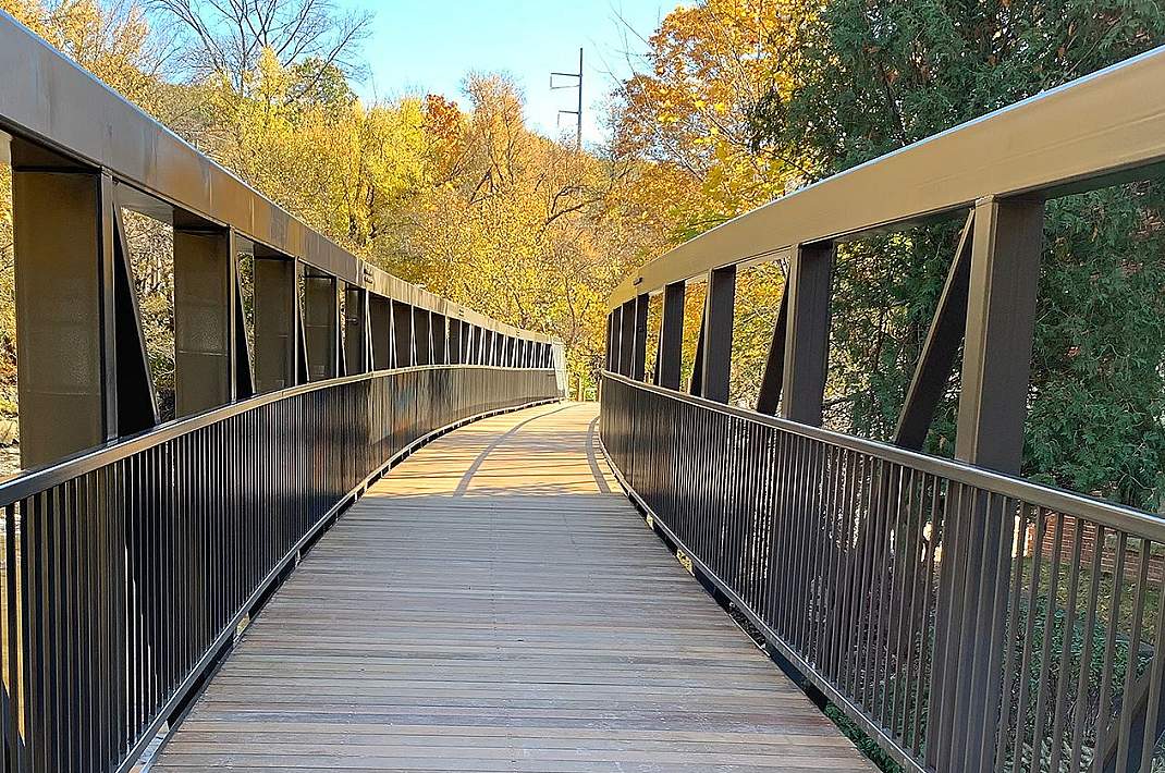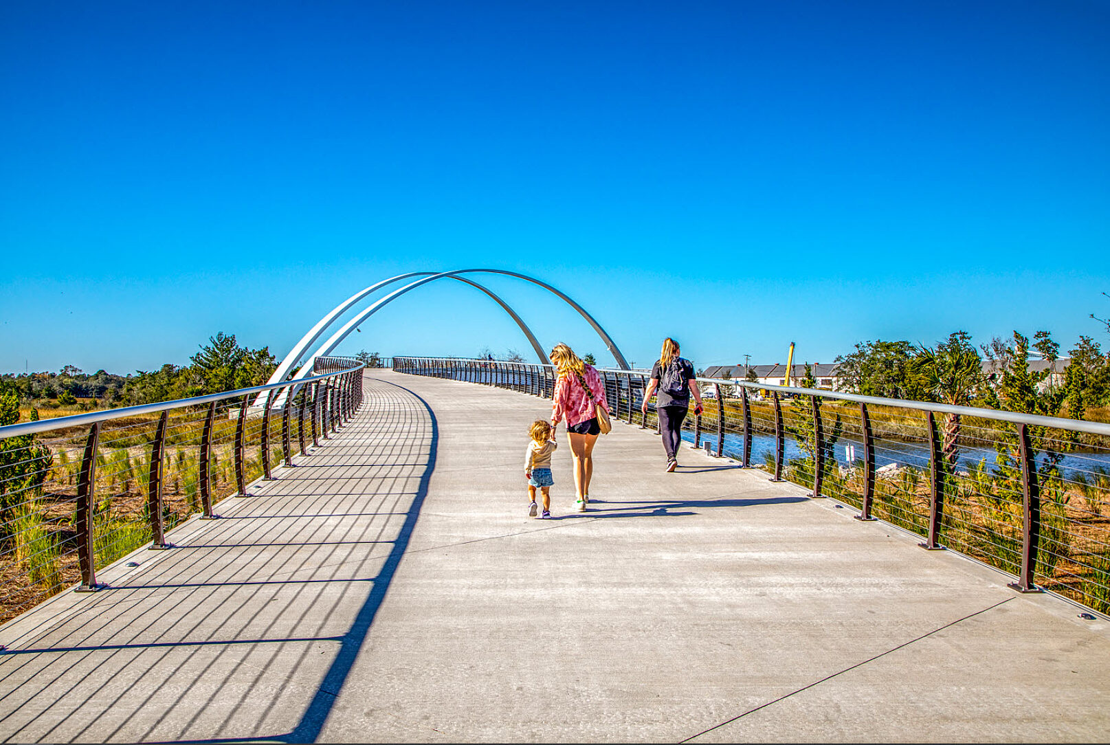 Expanding the greenspace and passive recreational areas of Riverfront Park, the Noisette Creek Pedestrian Bridge connects the existing park to the north side of Noisette Creek as part of the overall vision for the community development.
