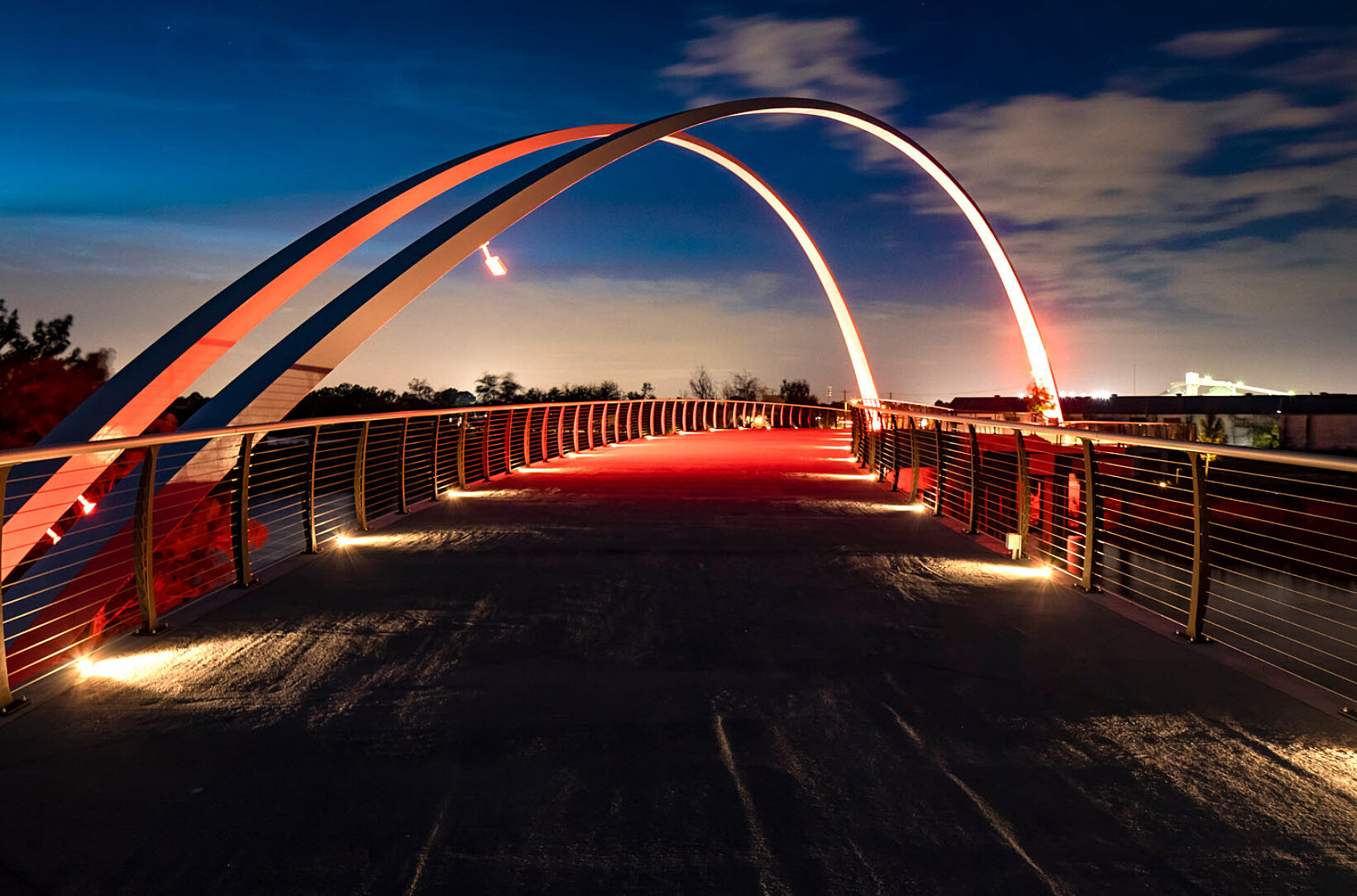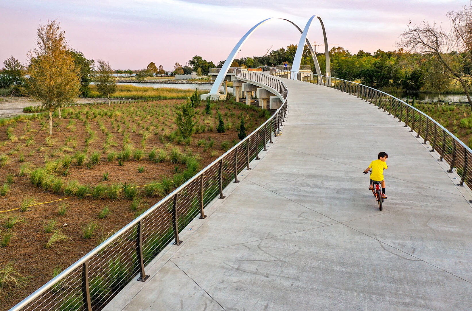 Designed by Thomas & Hutton, the Noisette Creek bridge in North Charleston, SC has been named by Architectural Digest as one of the 11 most beautiful elevated walkways through nature in the entire world. The meandering bridge was constructed as a place for people to enjoy the natural environment and the expansive water views while providing additional pedestrian access to the Riverfront Park. The curved pedestrian bridge includes a viewing platform at the midpoint across the bridge with a unique curved planter and bench.