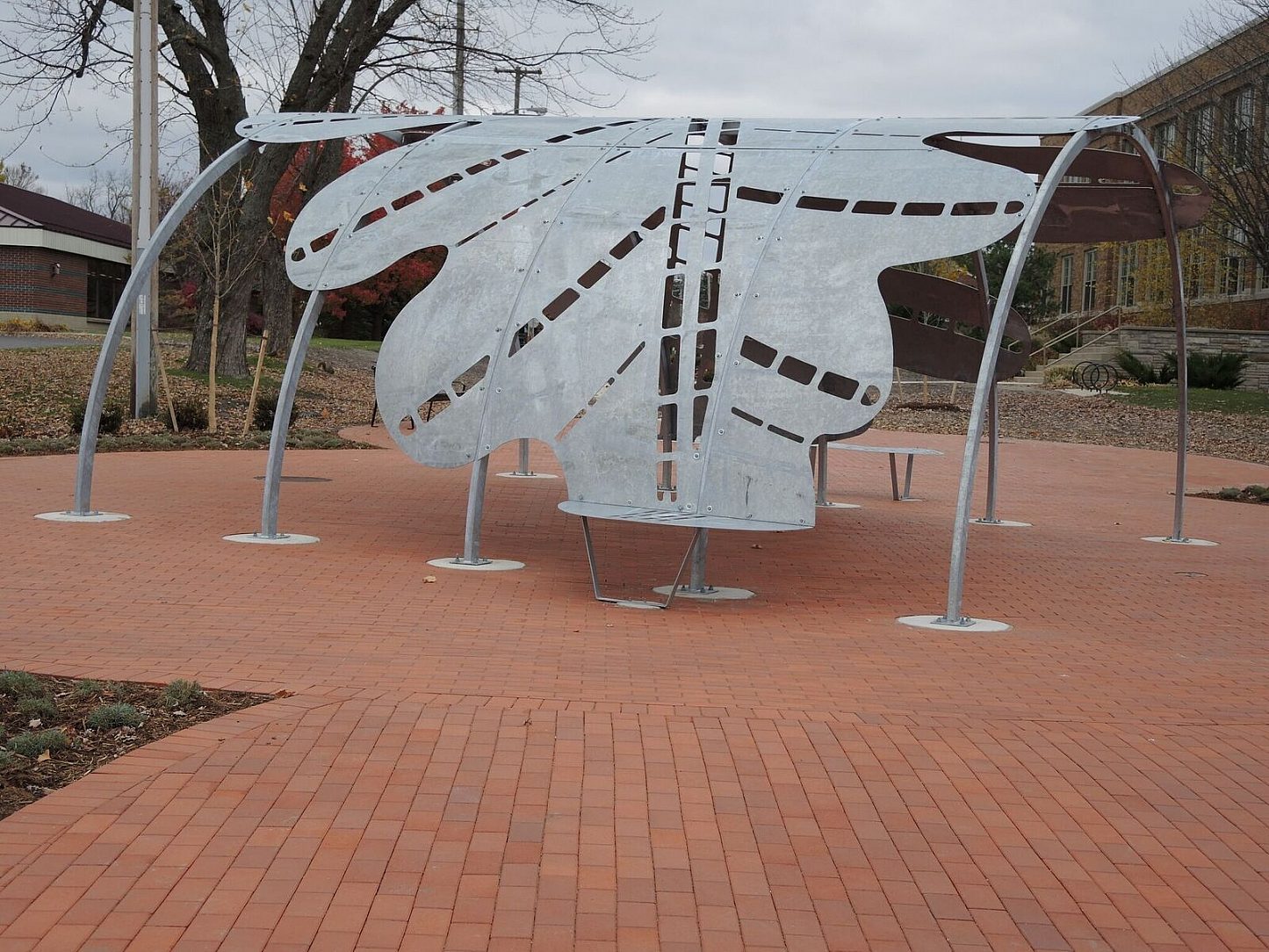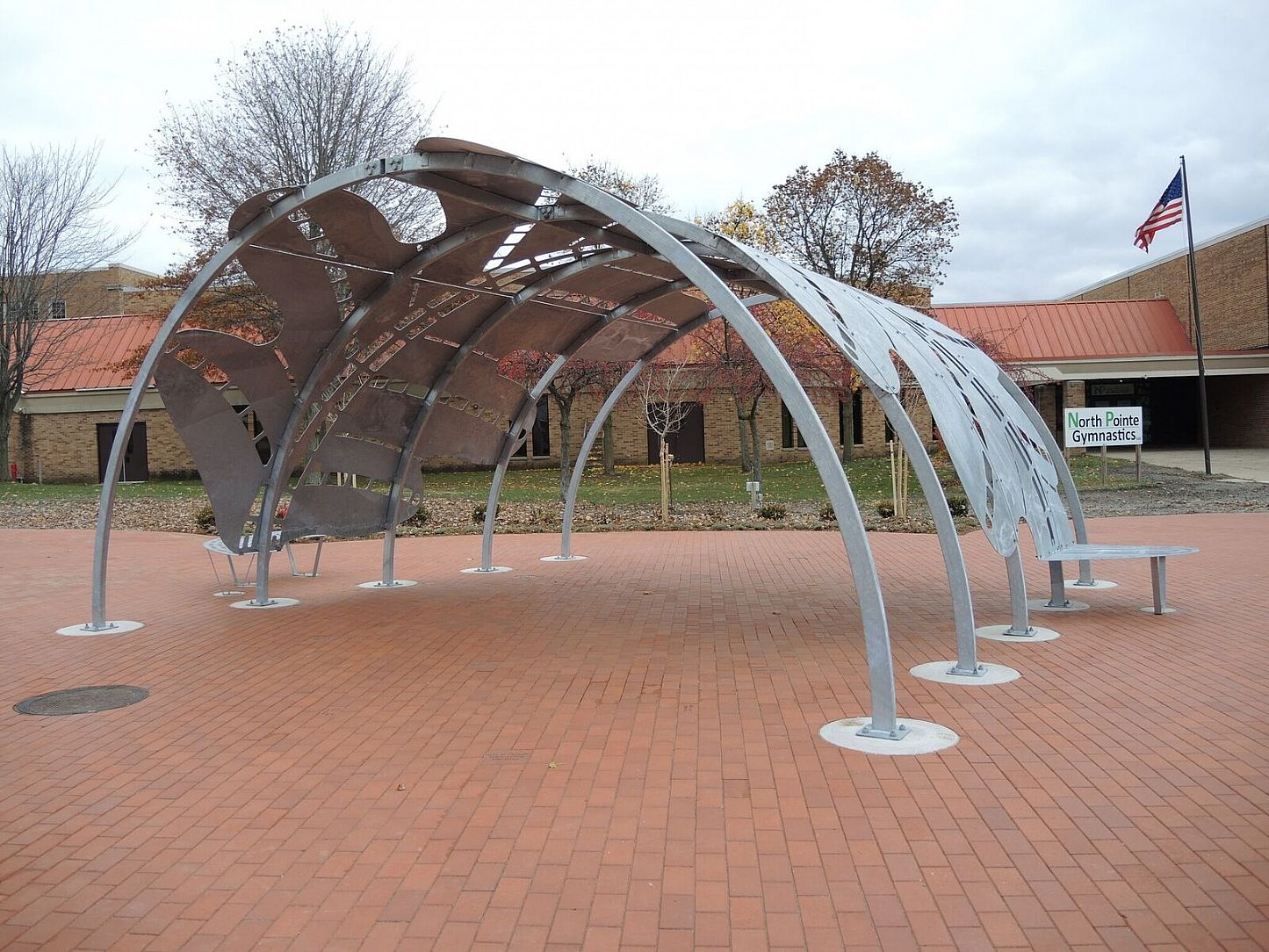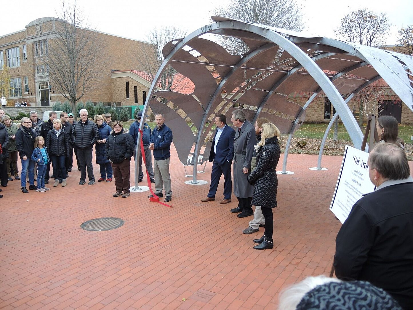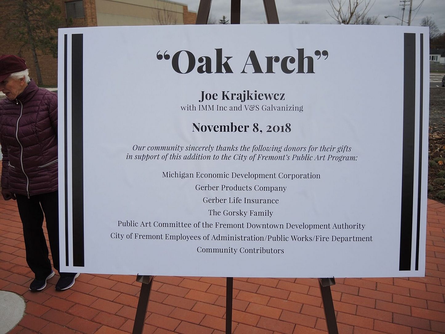 Michigan's "City of Fremont's Public Art Program" has been working tirelessly to maintain the public parks and facilities. When the program approached popular, local sculptor Joe Krajkiewcz to come up with an idea to bring the parks and facilities together he came up with this perfect solution. A Oak Leaf Arch leading from the park to the Public Building.