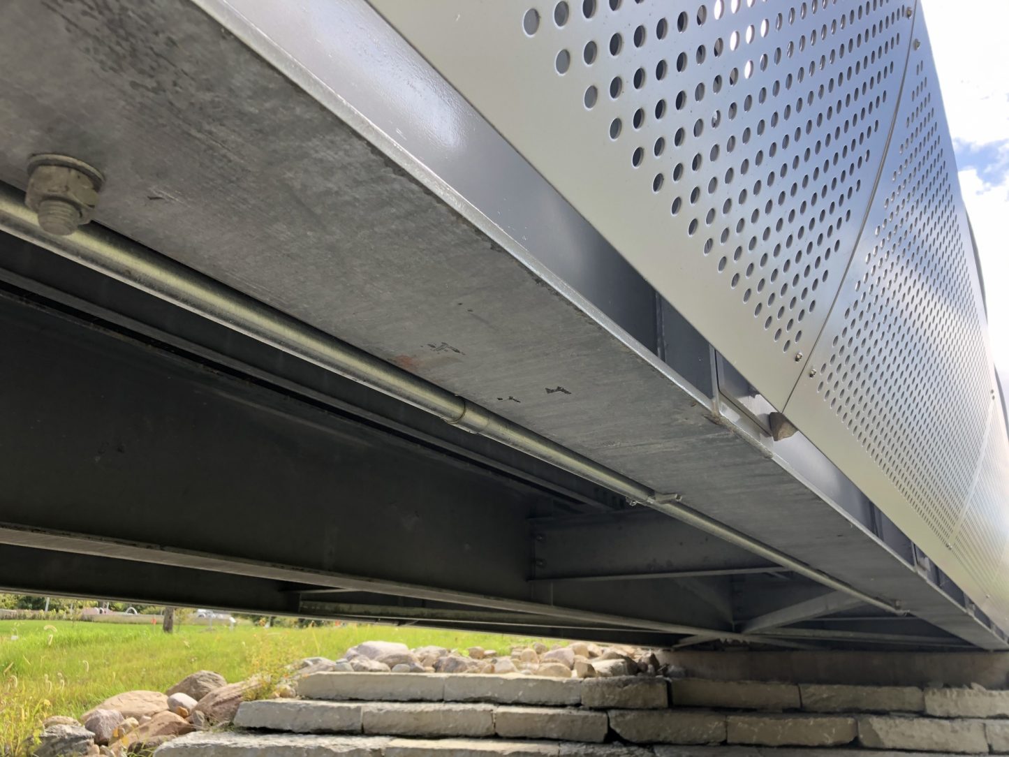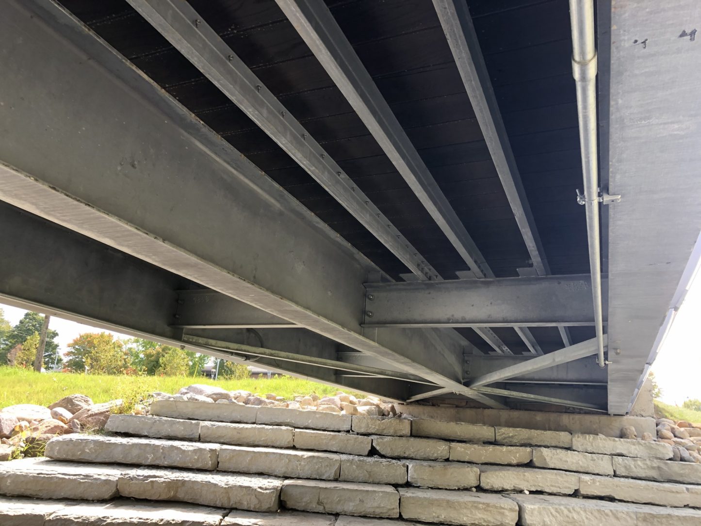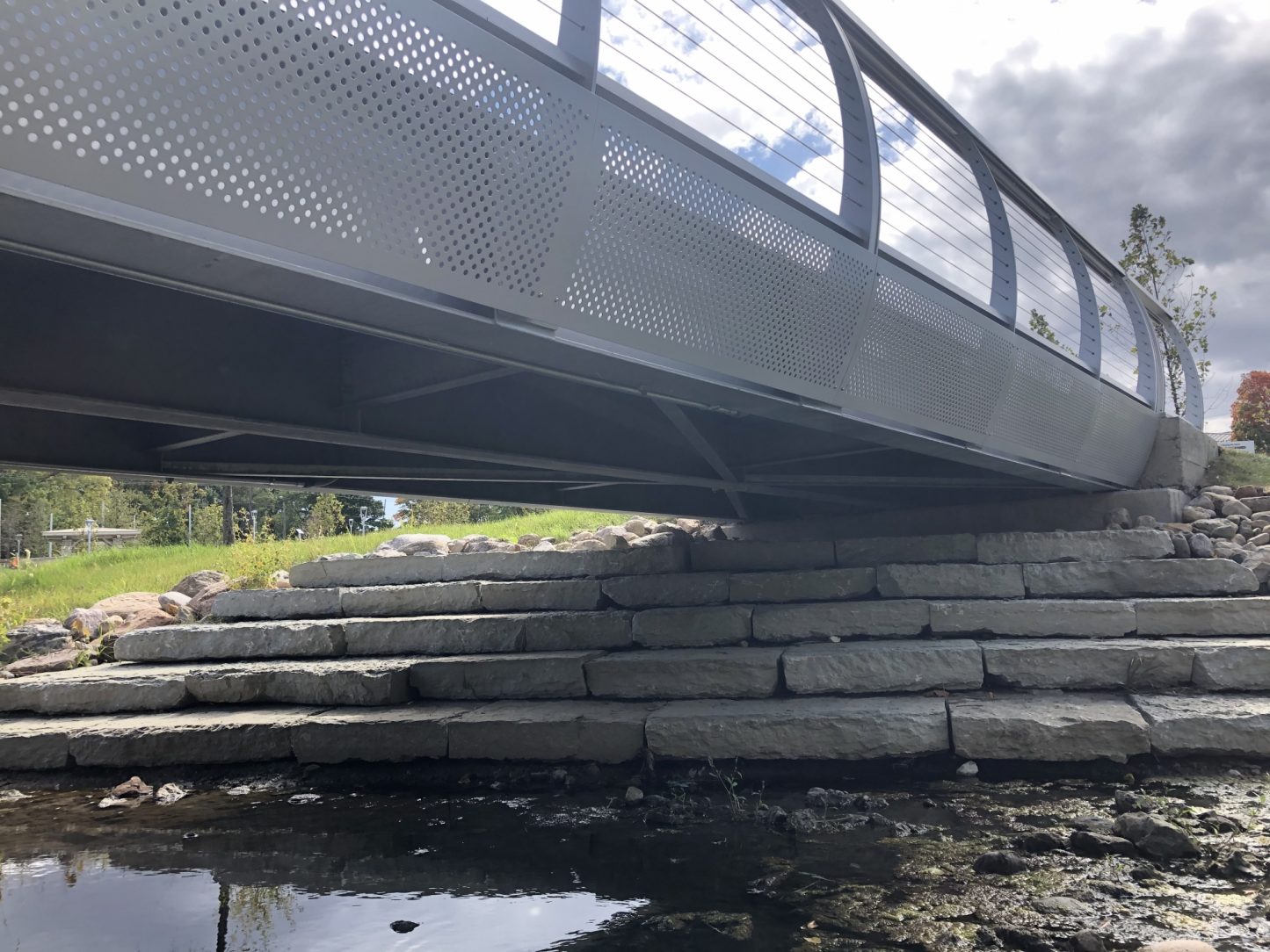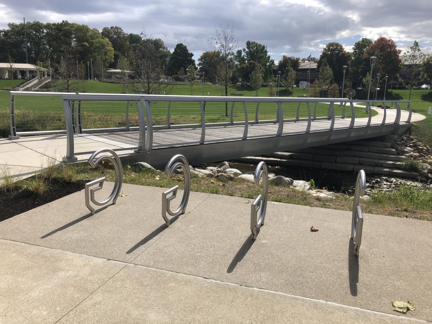 Multiple coatings help to give this walking bridge additional corrosion protection from the harsh winters in Indiana. Galvanizing the structural steel on this bridge was a easy decision for sustainability of the park. Wet paint was used on the sides of the galvanized steel to help provide additional corrosion protection and blend aesthetics. The galvanized steel is topped with heat treated, thermally modified ash wood to bring back the natural element to this sophisticated design. It's connected with pregalvanized bolts and cradled in powder coated, perforated stainless steel panels for a modern touch. Twice the coatings help to provide twice the corrosion protection and minimize the cost for maintenance. A sleek, powder coated stainless steel handrail compliments the overall design, welcoming visitors to cross over the creek and check out what the other side of the park has to offer.