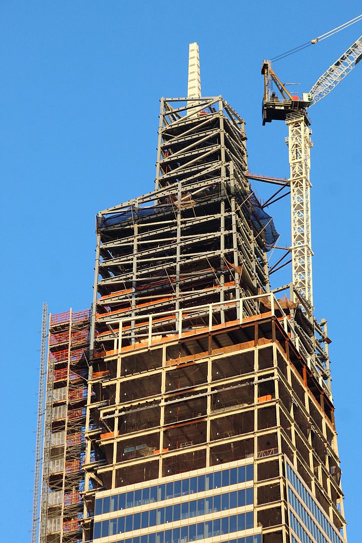 The $3 billion tower is three months ahead of schedule in a project that has saved $100 million due to pioneering use of state-of-the art 3-D construction modeling technology with documents that are made available on iPads. The steel is all American, from Coatesville, Pa., Lynchburg, Va., and South Plainfield, NJ and each of the 26,000 pieces was counted and barcoded before being assembled on the site into the 1.7-million-square-foot building.