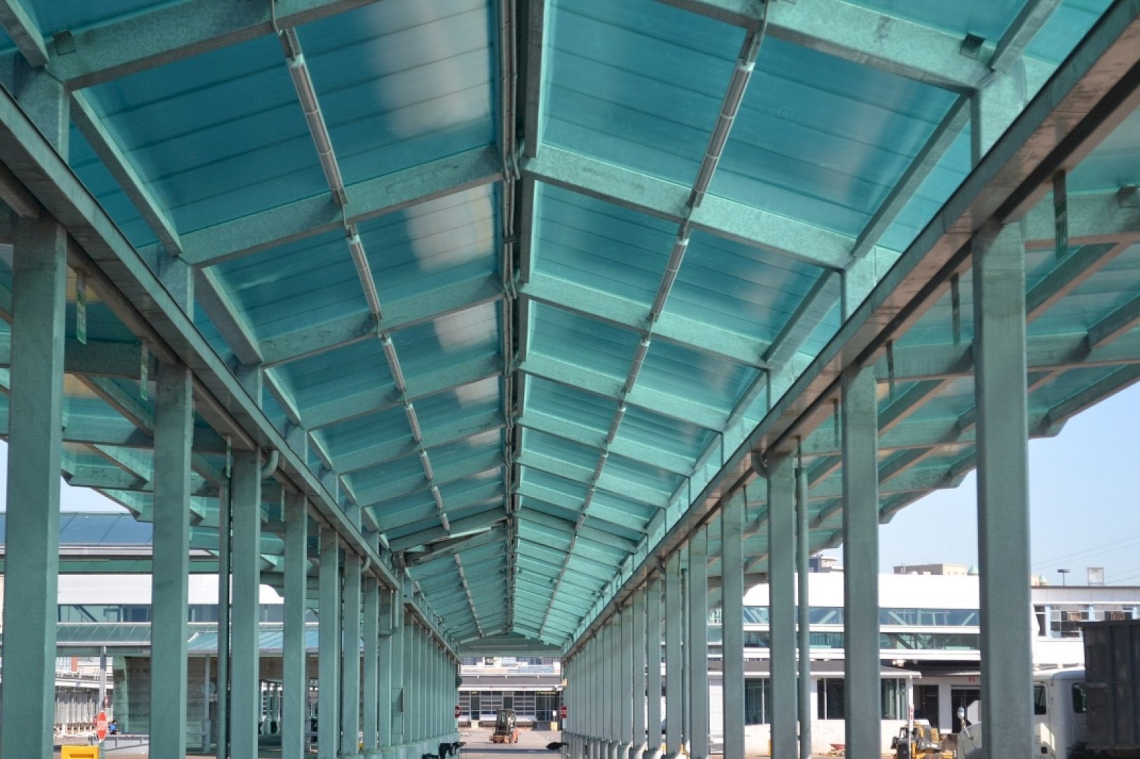 Norak Steel Construction Ltd. was chosen to fabricate a loading corridor canopy. The project required 117 tons of galvanized steel and included columns, purlins, canopy frames and structural anchors. The new construction links the farmer market stalls to the loading bays and provides covered protection from rain, snow and the sun. Galvanizing was chosen to protect the steel from corrosion and to protect food from the steel. The clean look of the galvanized canopy structure fits nicely within the food industry application. The initial upfront and long-term coating cost of expansion was a major factor as the operation & maintenance of the Terminal rely solely on the revenues generated within the facility. The warehousing and transportation activity at the Ontario Food Terminal called on the durable, self-sacrificial merits of galvanizing to minimize maintenance cost over time.
