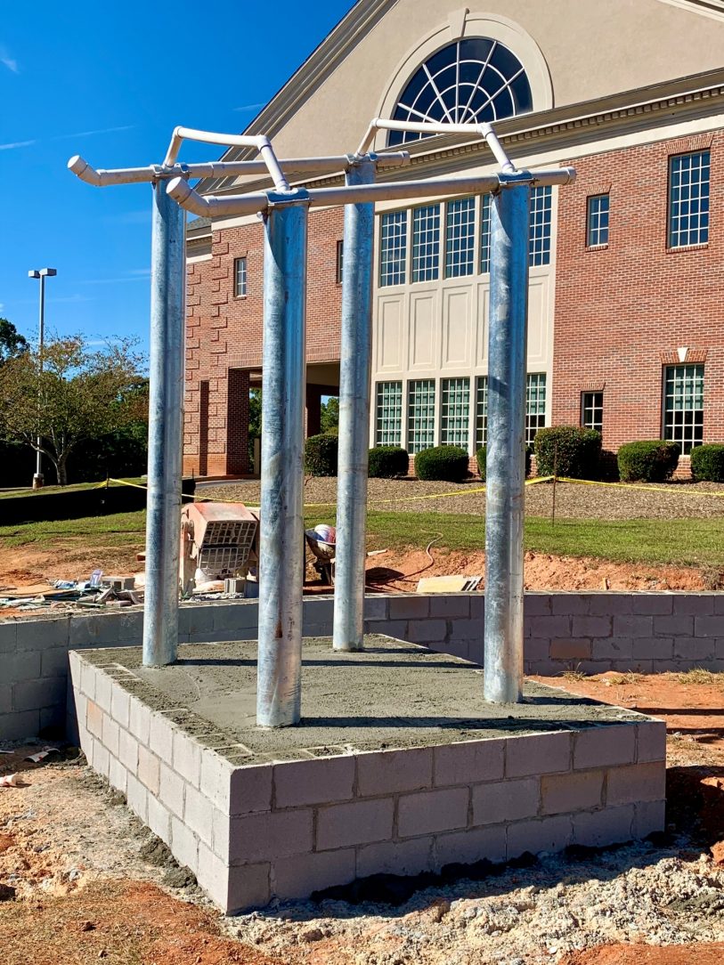 Hot dip galvanizing was chosen to protect the columns and the connecting hardware from rust for decades to come. The aesthetic of the matte gray galvanized finish compliments the stone and military helicopter “hovering” above it. Special care was taken in the design and placement of vent holes in columns to ensure corrosion protection inside and out, and to prevent damage during the galvanizing process. The galvanized coating was provided at no charge as a donation to the project.