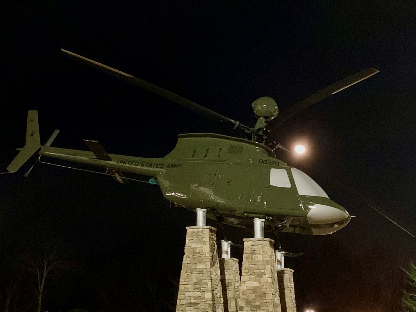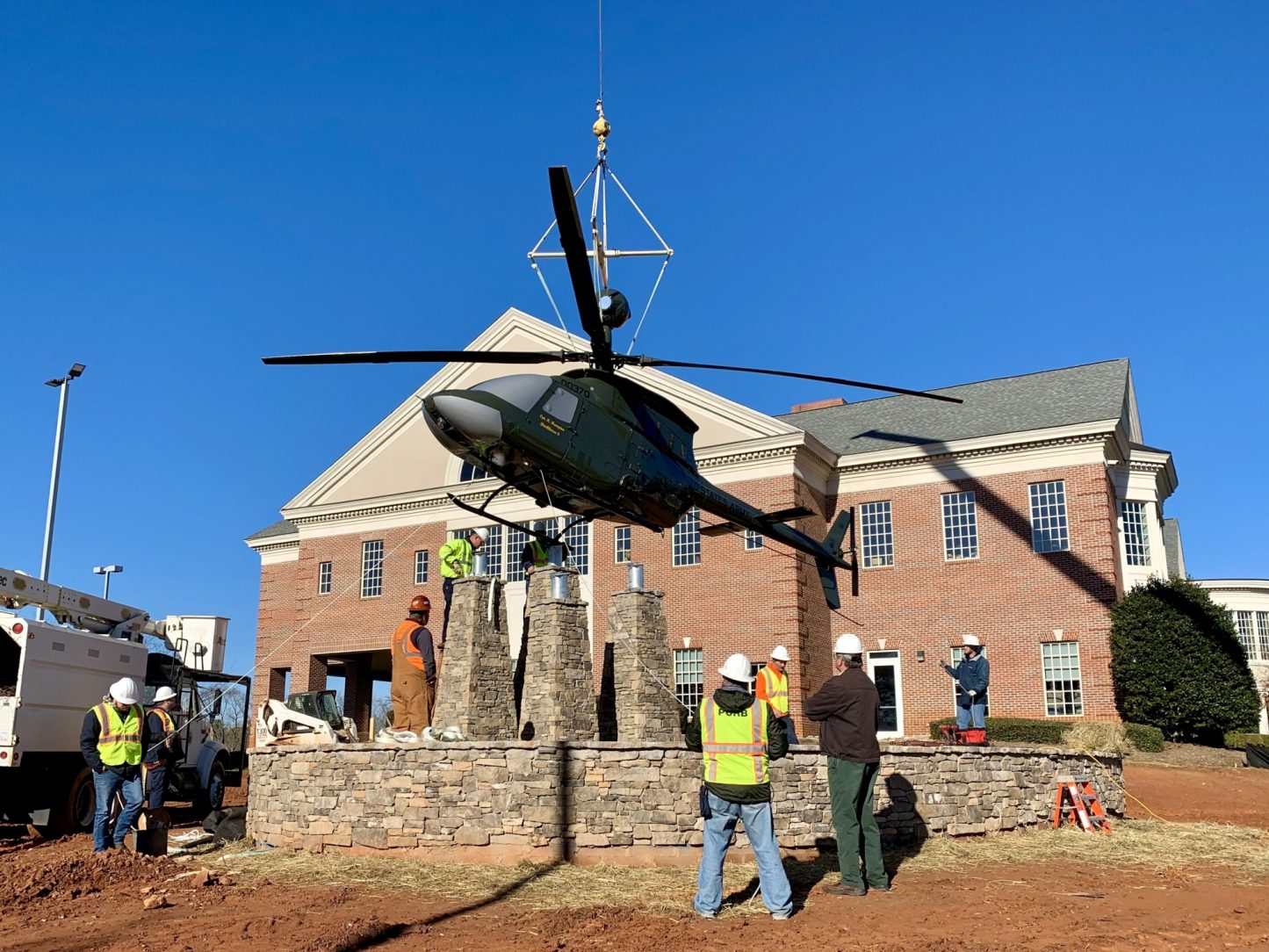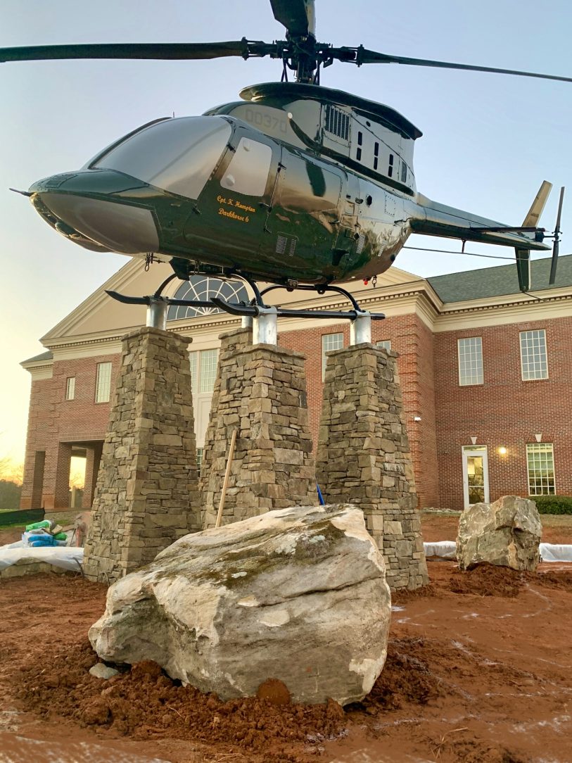The design envisioned by Mr. Garrison included mounting a helicopter similar to the one Capt. Hampton was piloting when she was shot down near Fallujah above four stone pillars. Steel pipe columns, eight inches in diameter, would be set inside the columns to support the aircraft.