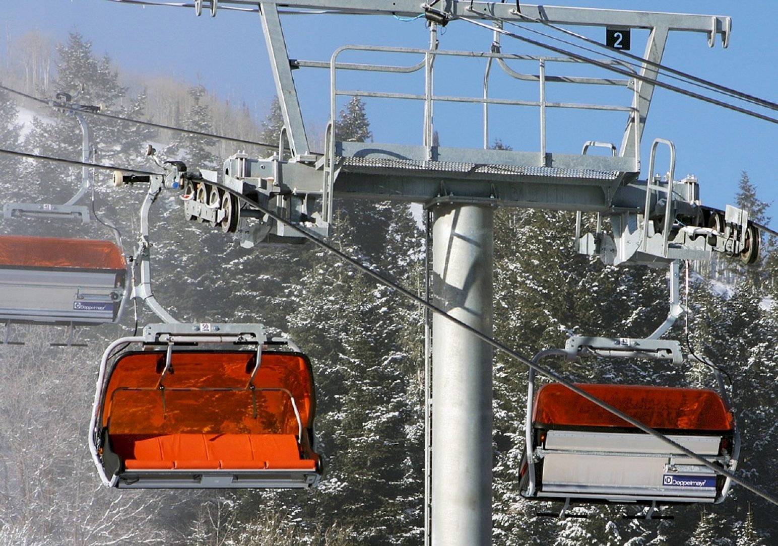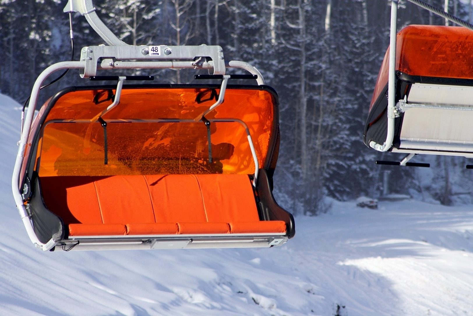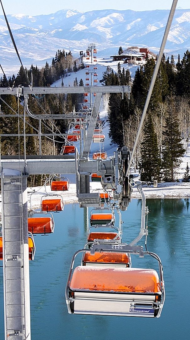 Like a strand of Christmas lights strung to the top of the mountain, the vividly orange protective shields and glimmering galvanized steel of the Orange Bubble Express Lift chairs stand out amidst the crisp white snow blanketing the landscape.