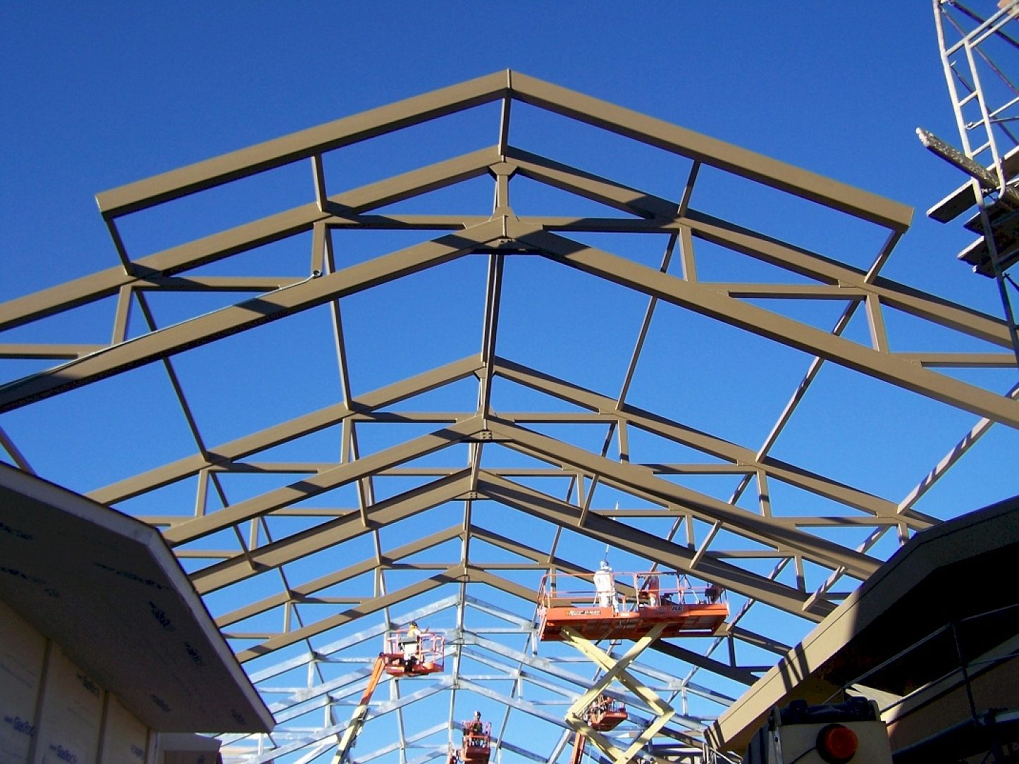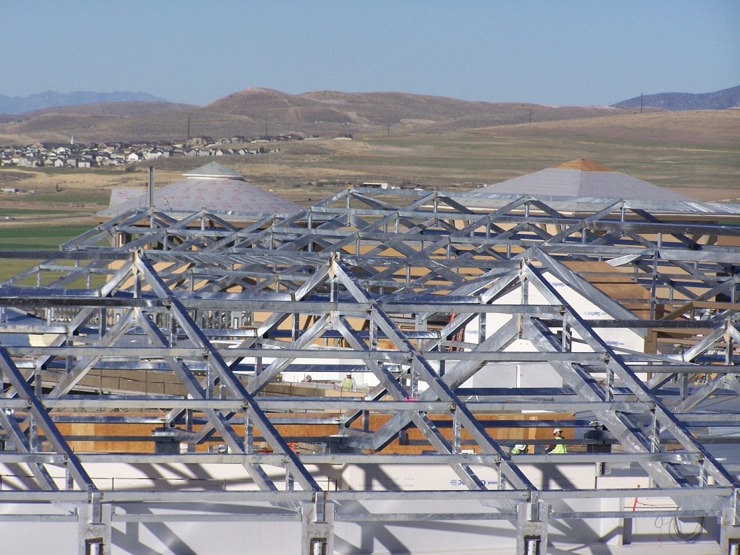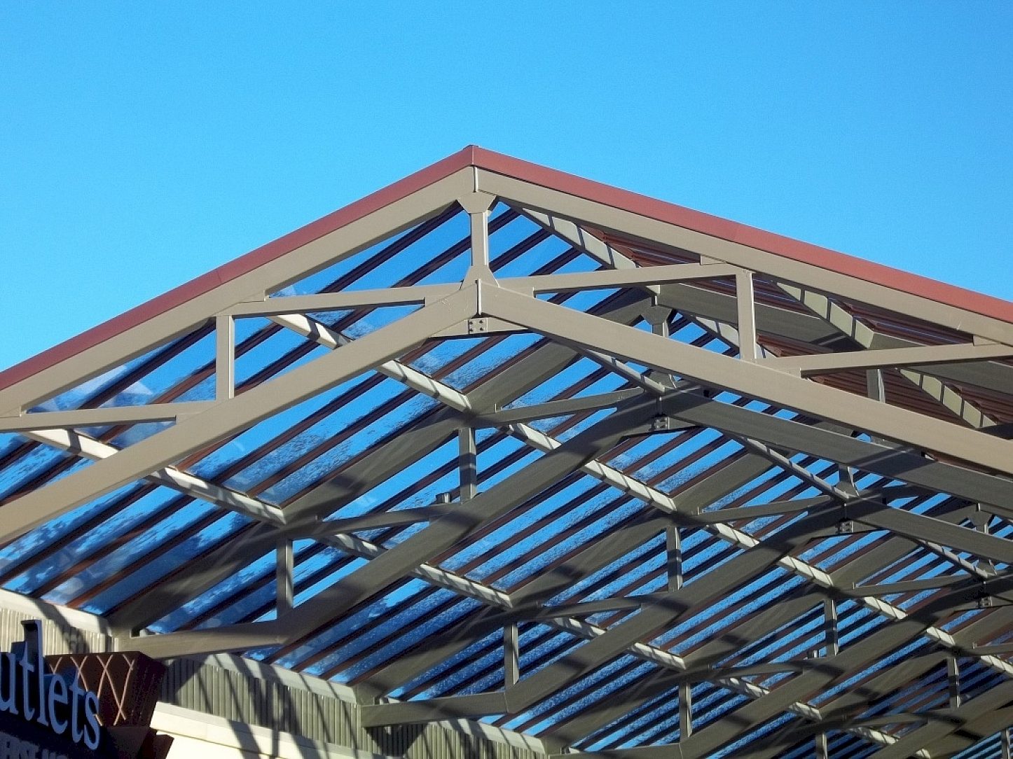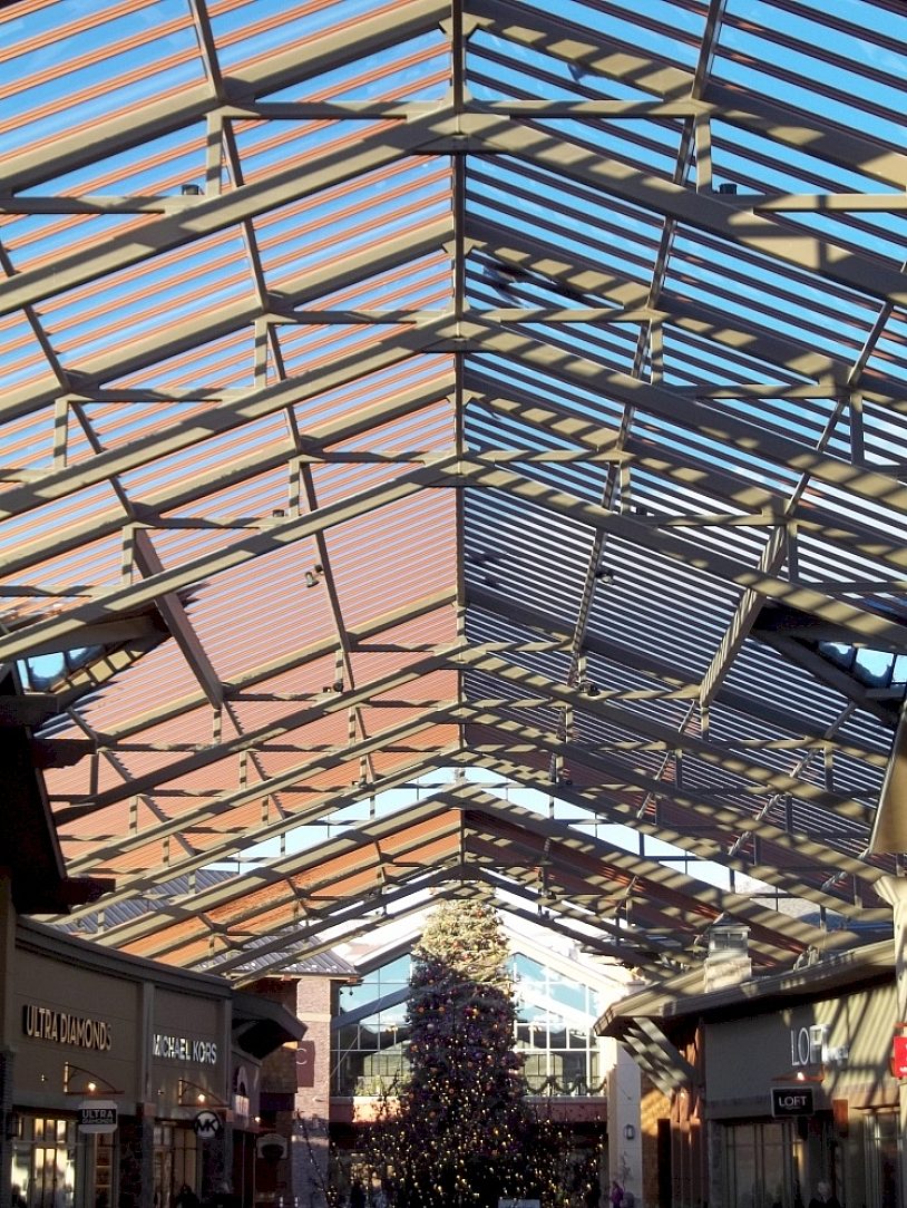 The roof system on this $70 million retail center in Lehi, Utah, was designed with a glass atrium canopy over the walking areas to provide shelter to shoppers from weather usually found to be severe in winter.