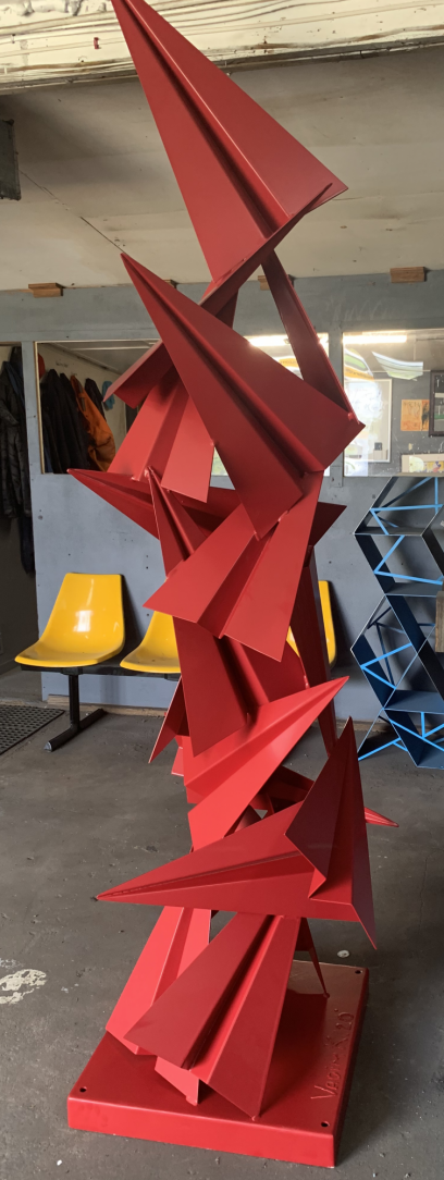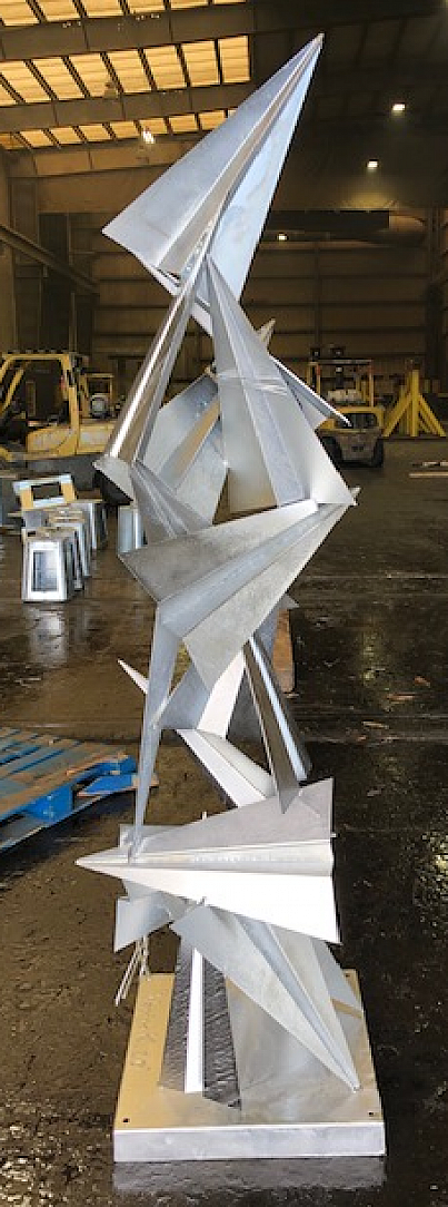 This free standing, tall, abstract piece of art resembles paper airplanes, and is positioned at a hangar in Houston, TX. It is made of bent plates, and hot-dip galvanized with powder coating. This modern outdoor sculpture is made to last.