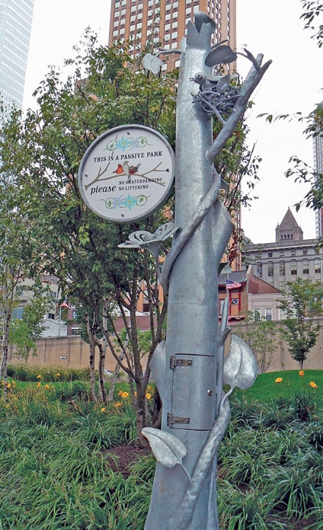 This whimsical tree shaped sculpture stands in Pittsburg Park, Pennsylvania. The intricate and playful design is the host for the parks signage. The piece features a locking door for cigarette disposal to contribute to the cleanliness of the park. This artwork contains flowers, branches, leaves, and even a bird resting in his nest. Because of the elaborate design, it was essential this artwork received the best protective coating available. The park chose galvanizing in order to protect the signage from the harsh outdoor elements of Pittsburg. The playful design and the durable hot-dip galvanized coating unite to form something pleasing to the eye, functional, and virtually maintenance free.
