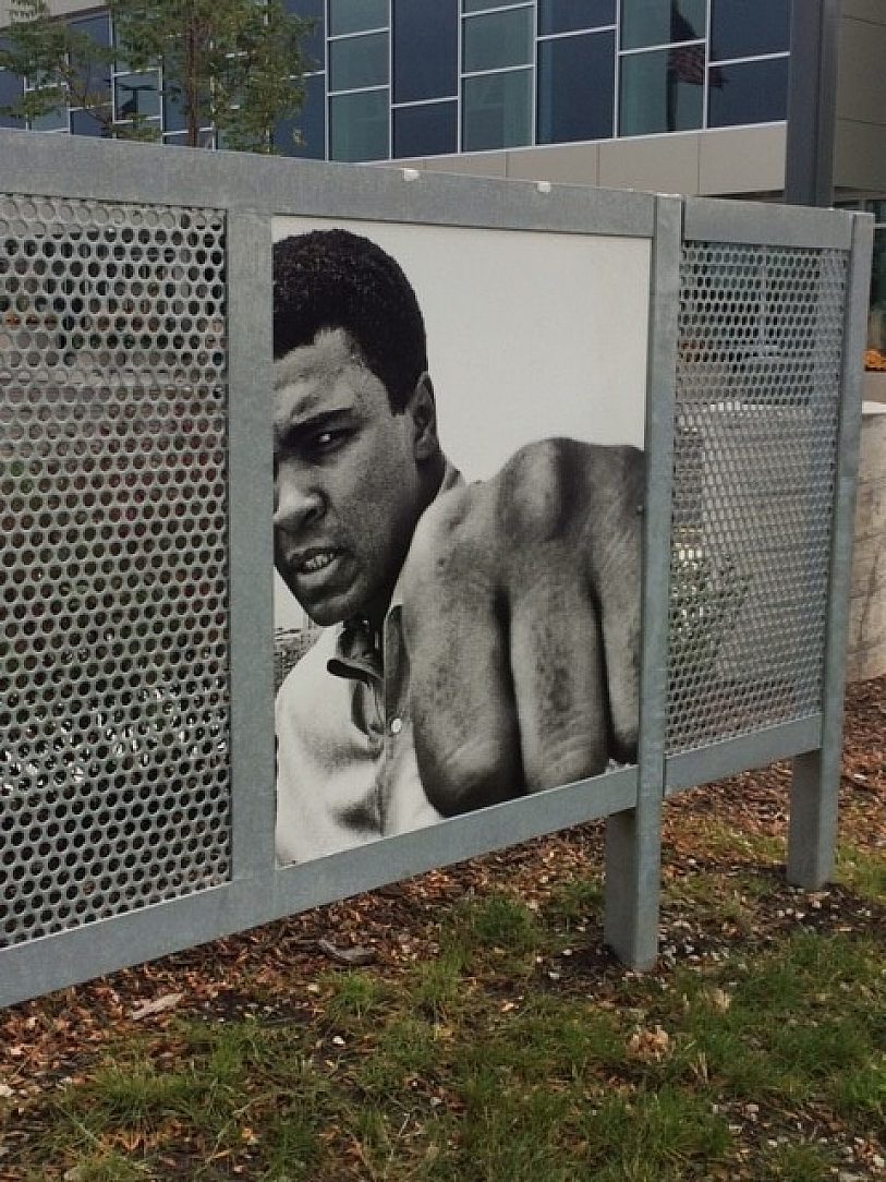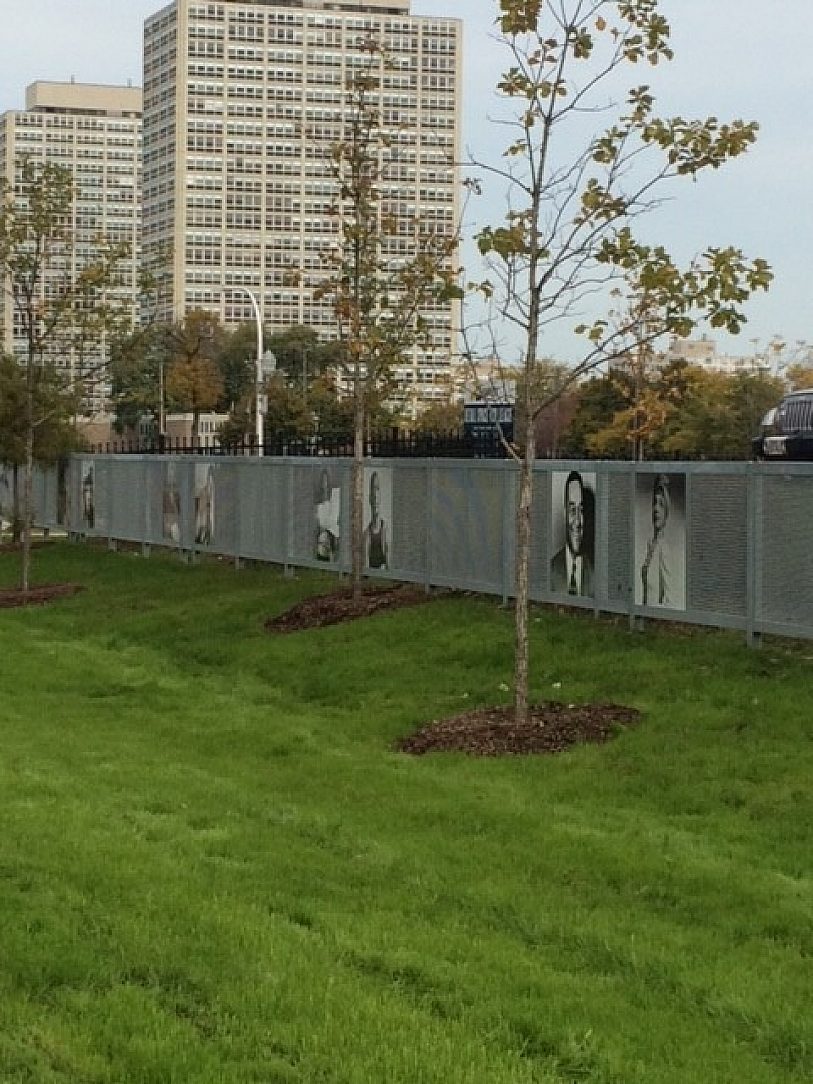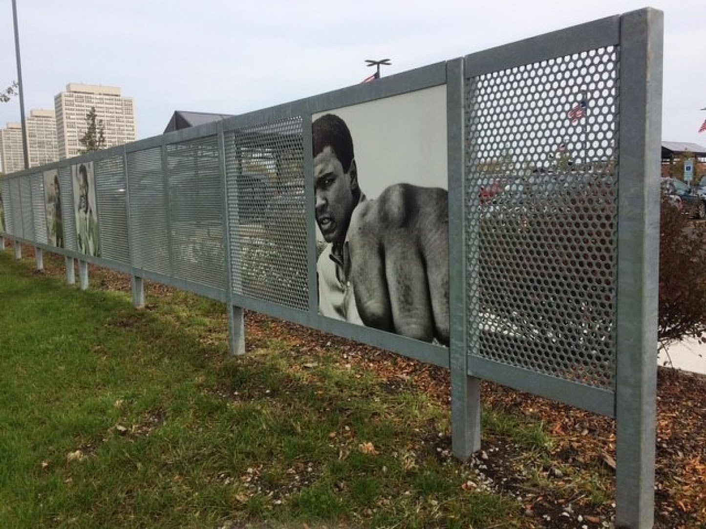 The artwork incorporated into the fence panels depicts the heroes from the neighborhood that have celebrated success.