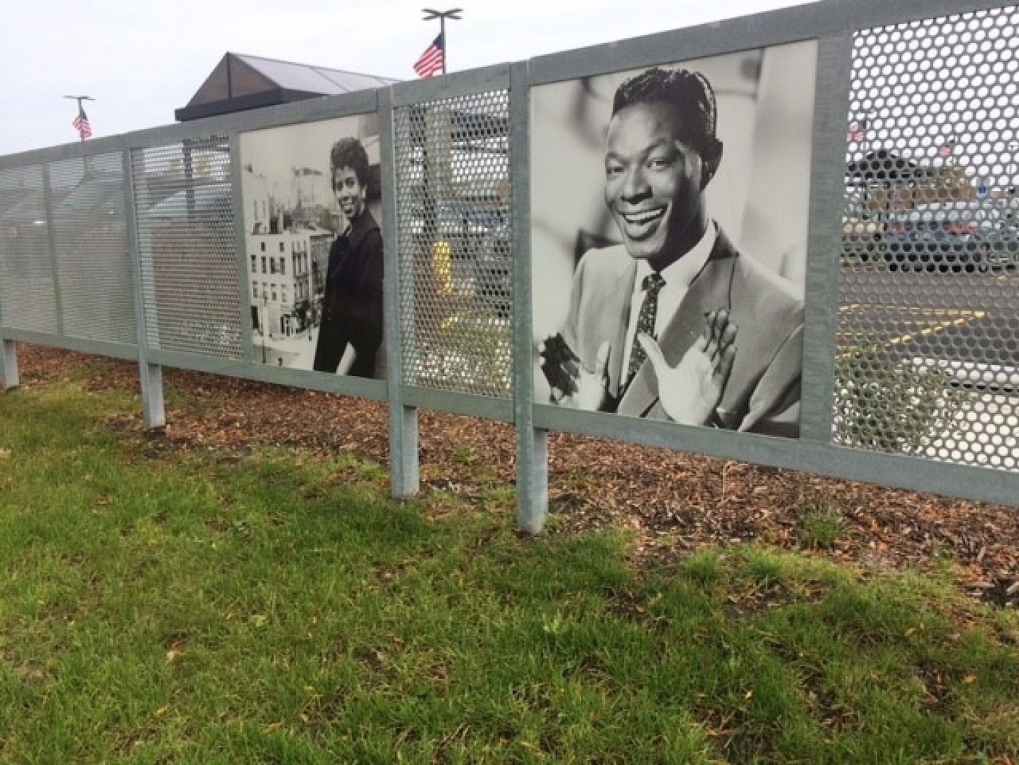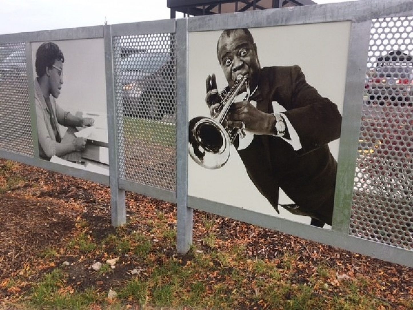 On the store's exterior there was a galvanized fence constructed that includes giant photos of area legends, such as Louis Armstrong, Nat King Cole, Muhammad Ali and dozens of others who are part of the rich history. The artwork incorporated into the fence panels depicts the heroes from the neighborhood that have celebrated success.