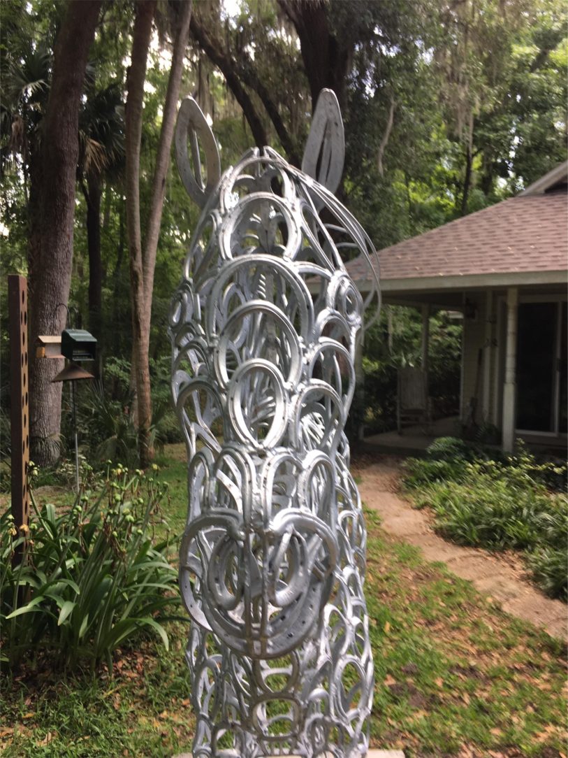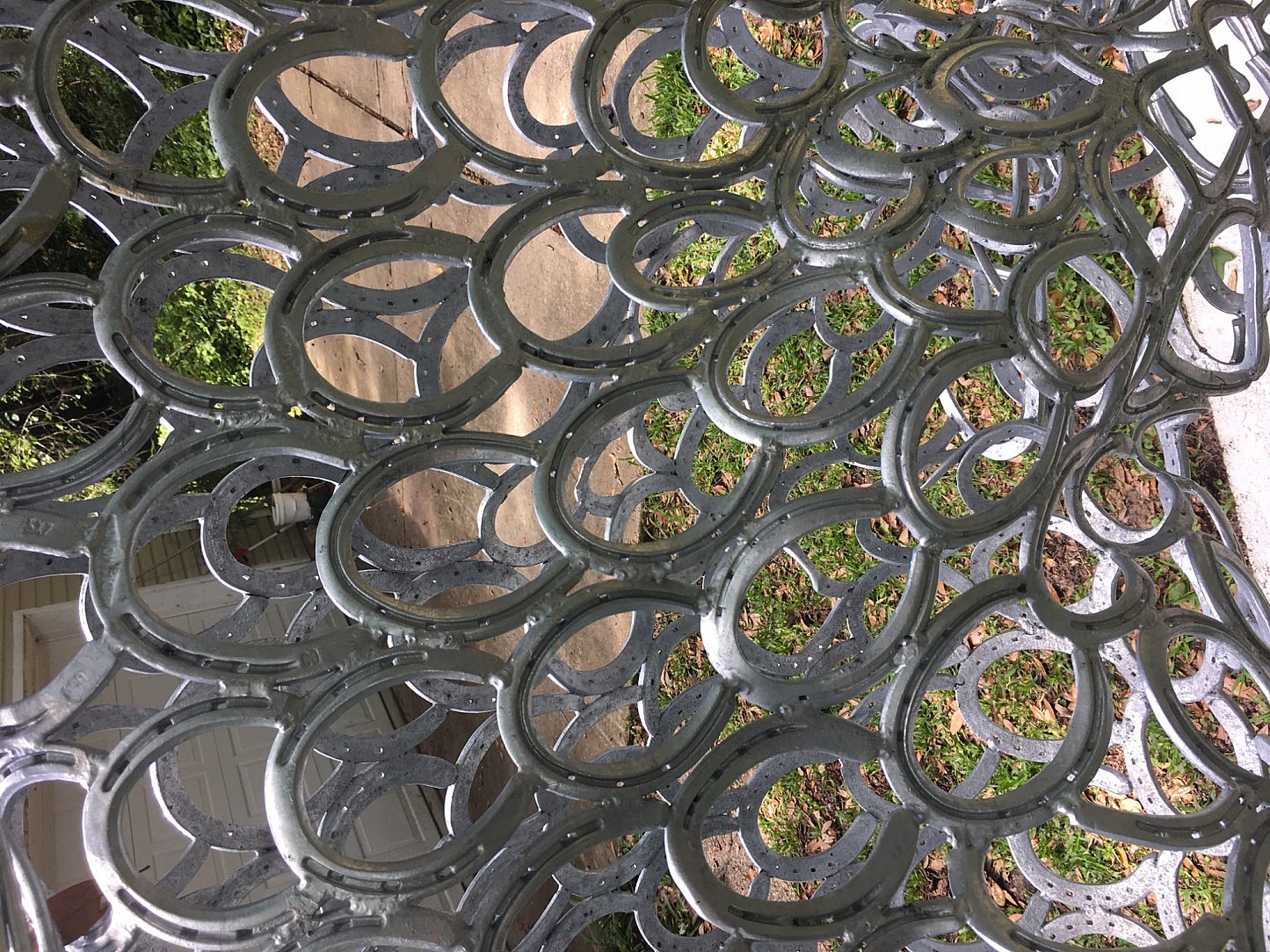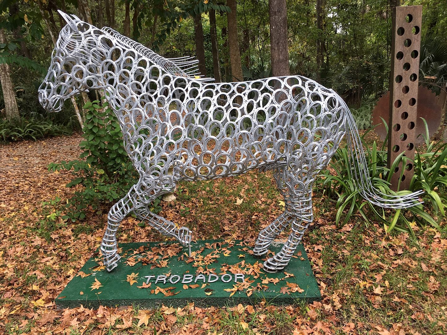 The inspiration for the sculpture is Trobador, an 18 year old Paso Fino horse, which is the pride and joy of his wife, Virginia. It’s true as the saying goes, you cannot rush perfection. From start to finish, Mr. Elder spent 5 years and just over 1,000 man hours to complete his horse sculpture. Prior to fabrication, Mr. Elder took a picture of Trobador, one in which he felt exemplified the beauty and spirit of the Paso Fino breed. The picture was loaded into his CAD software system and enlarged to full scale. He then printed the full scale model on 8-1/2” x 11” copy paper, glued each piece of paper to a piece of plywood, and alas, his horse model came to life. The entire body of the horse was fabricated using horseshoes that were donated by local farriers. Every time a horse was given new shoes, the farriers would throw the old shoes in a bucket, and then donate a bucket full at a time. The mane and tail sections of the horse were fabricated using ¼-inch steel rod which enhanced the natural lifelike look of the sculpture.