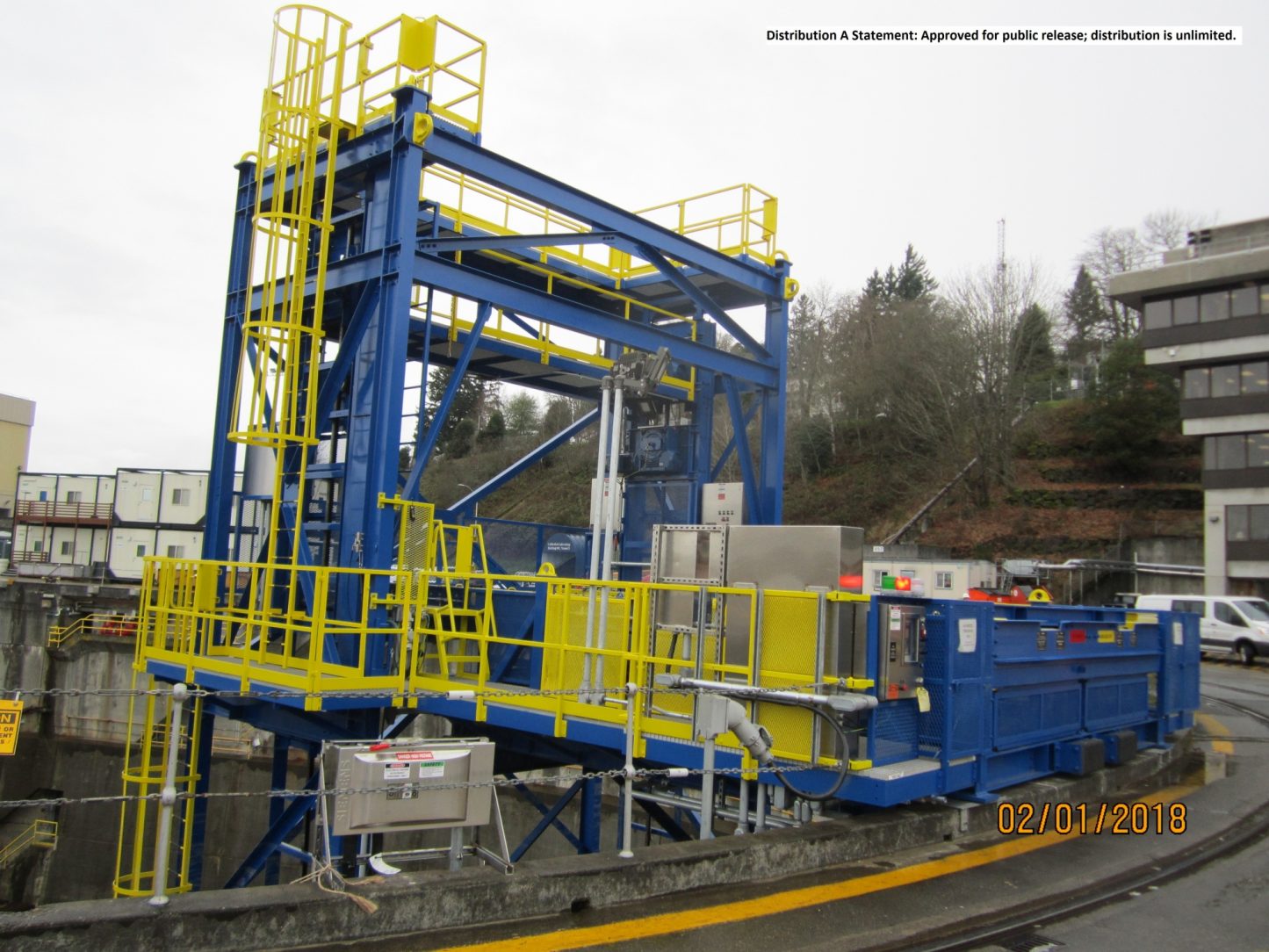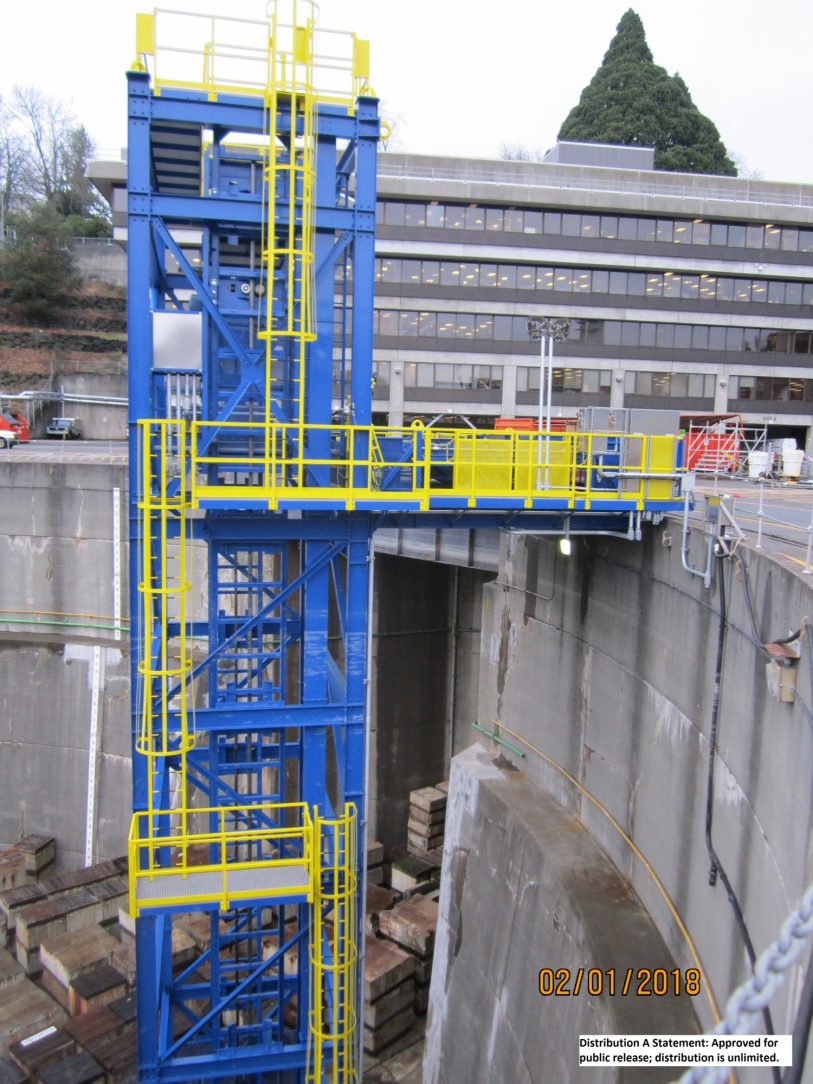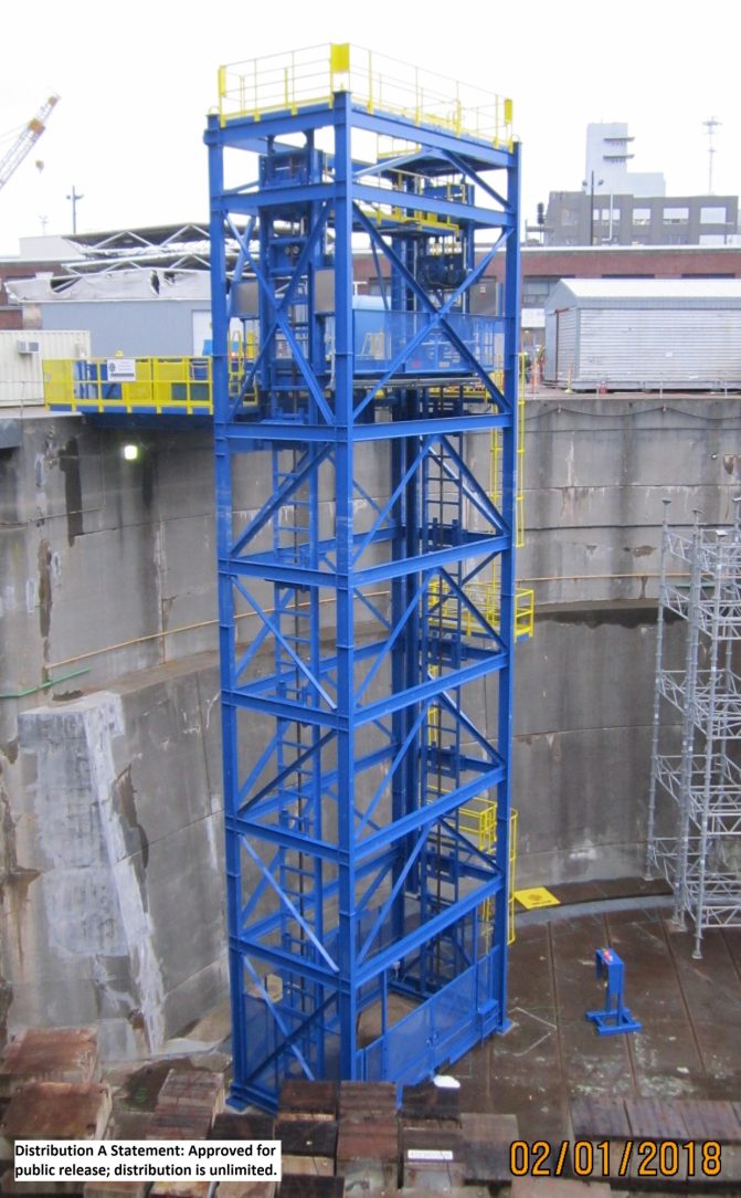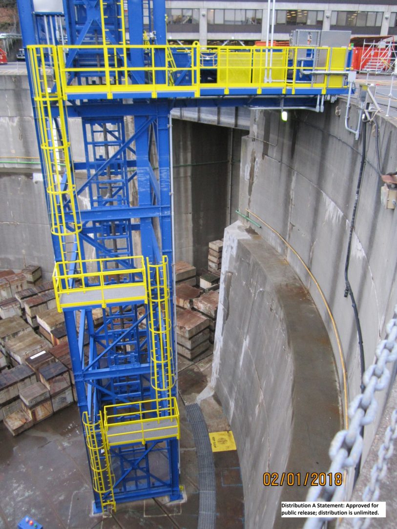The designers ingenuity to use the vertical reciprocating conveyor to act as a ramp allowing midshipmen and women along with supplies to be safely loaded and unloaded to any vessel in the submarine fleet and be protected from corrosion by HDG. Long lasting zinc provides a maintenance-free corrosion protection and for aesthetic purposes the duplex coating of epoxy primer & polyurethane top coat was added. The bright blue and yellow and colors met all safety requirements and increased life of the coating by 1.5 times. Congress elected to go with more curb appeal making corrosion control as important as the design life itself by enhancing the protection of steel submerged in the confines of the salty dry dock working area.