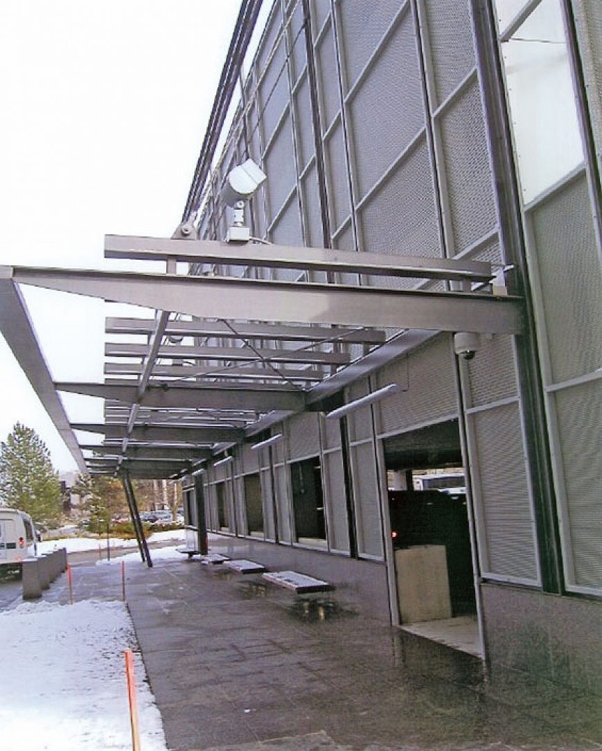 When constructing this precast concrete garage at the entrance of the seven story office building, the designers wanted to emphasize the adjacent courtyard and hide the cars from view. The solution the architect designed was perforated steel façade plates to screen in the car and provide an interesting back drop for the courtyard.