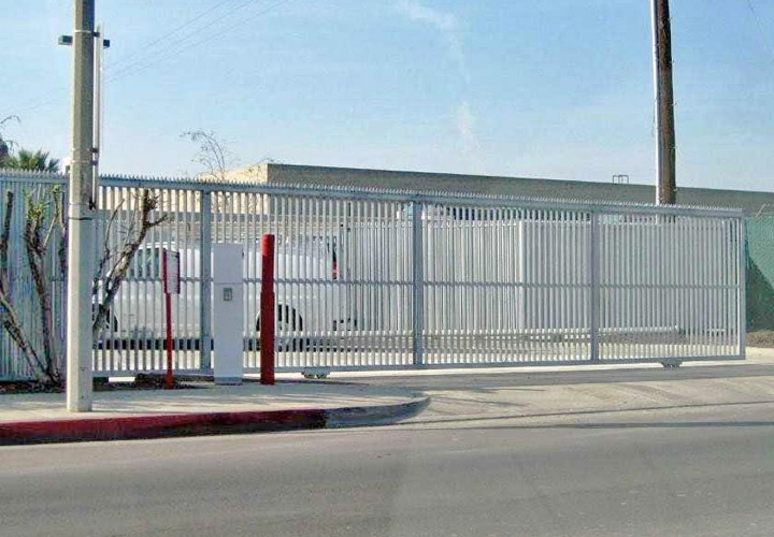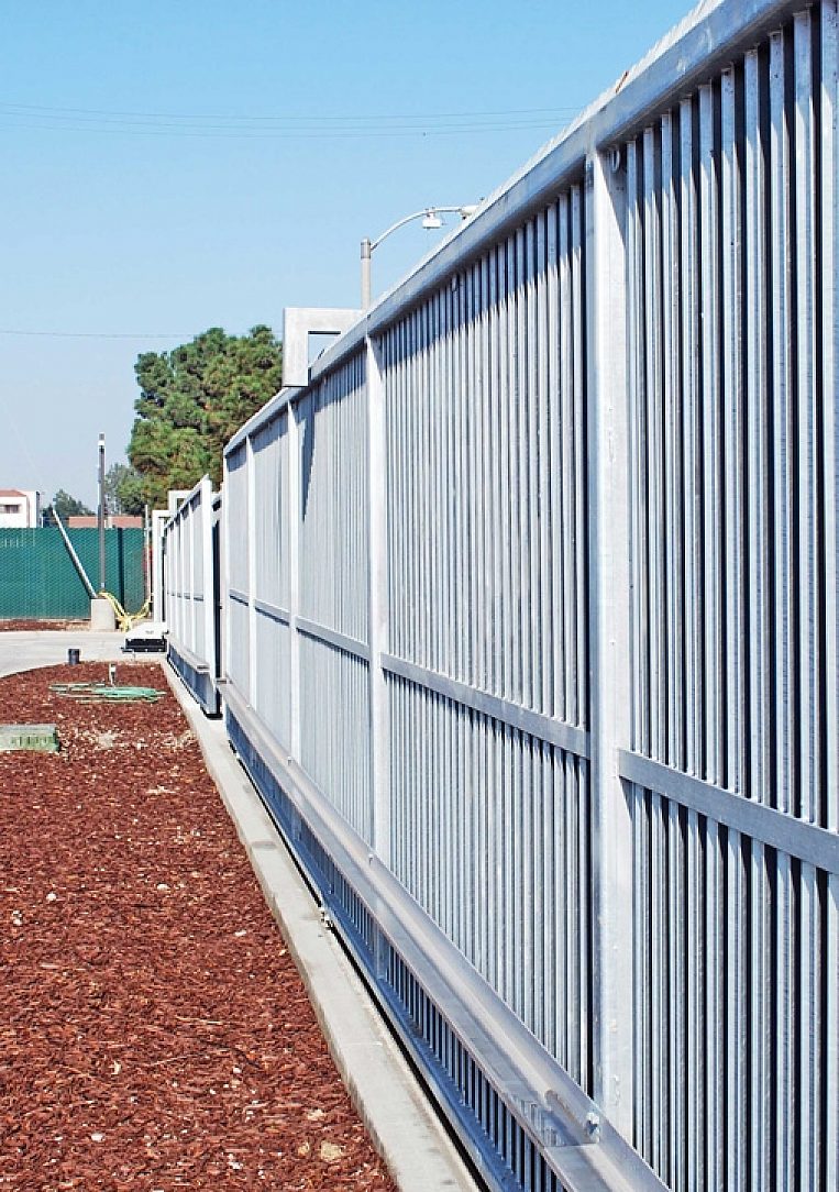 Gleaming in the sunlight behind a spray of decorative bushes, the heavy protective steel fence at the Rainbow Disposal Co was specifically designed to insure privacy and security for the overnight and long-term parking of the company's heavy-duty heavy-duty equipment.
