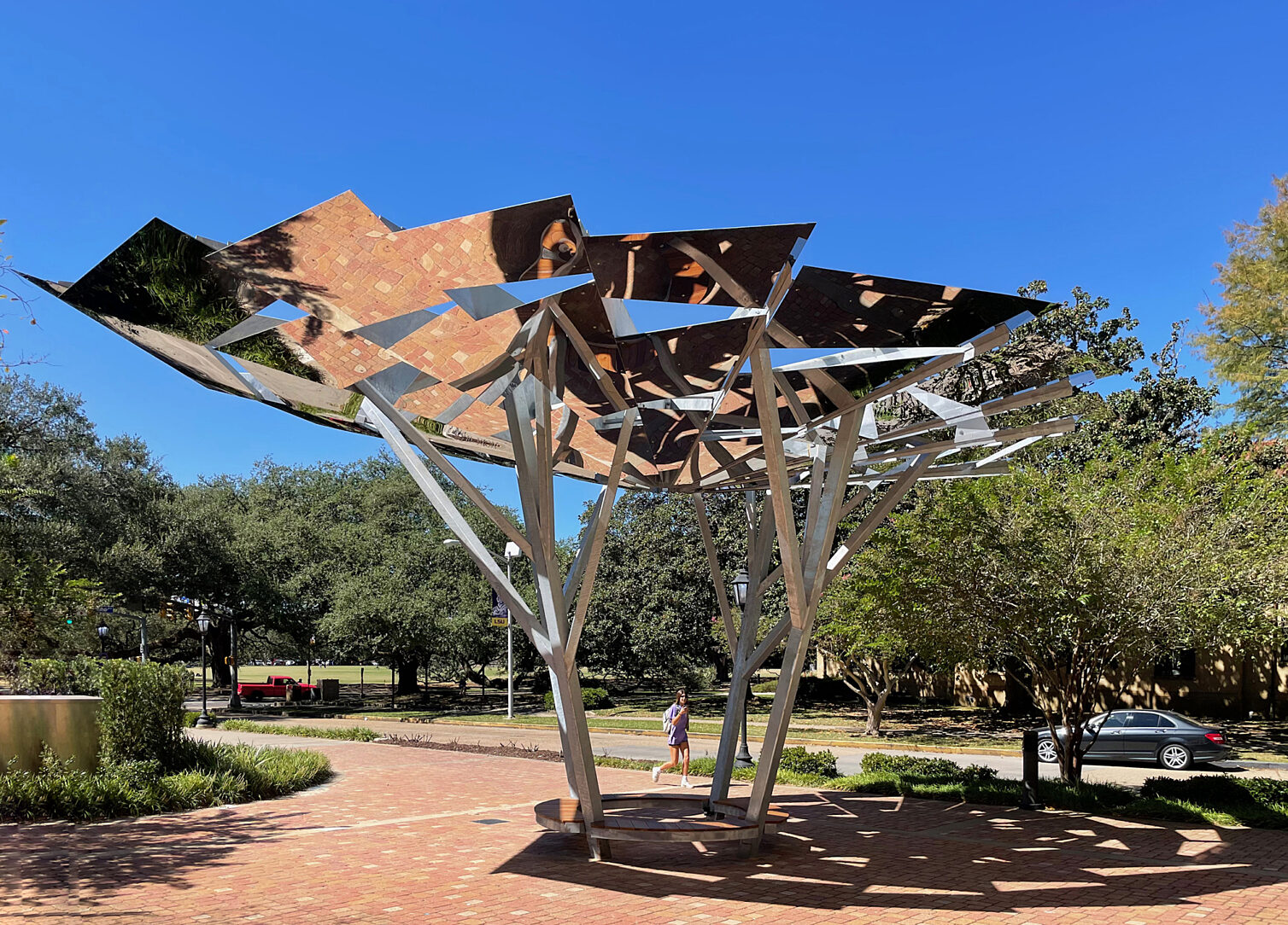 Created by artist John Fleming, Reflectivity represents the live oaks which remain an iconic symbol of the LSU campus. The sculpture, located outside the LSU Bookstore on Union Square, reveals the essence of the live oak with a mirrored canopy that reflects life at LSU. According to Fleming, Reflectivity is a landmark, a gathering place offering shade, and with its mirrored underside, a true reflection of all of us.