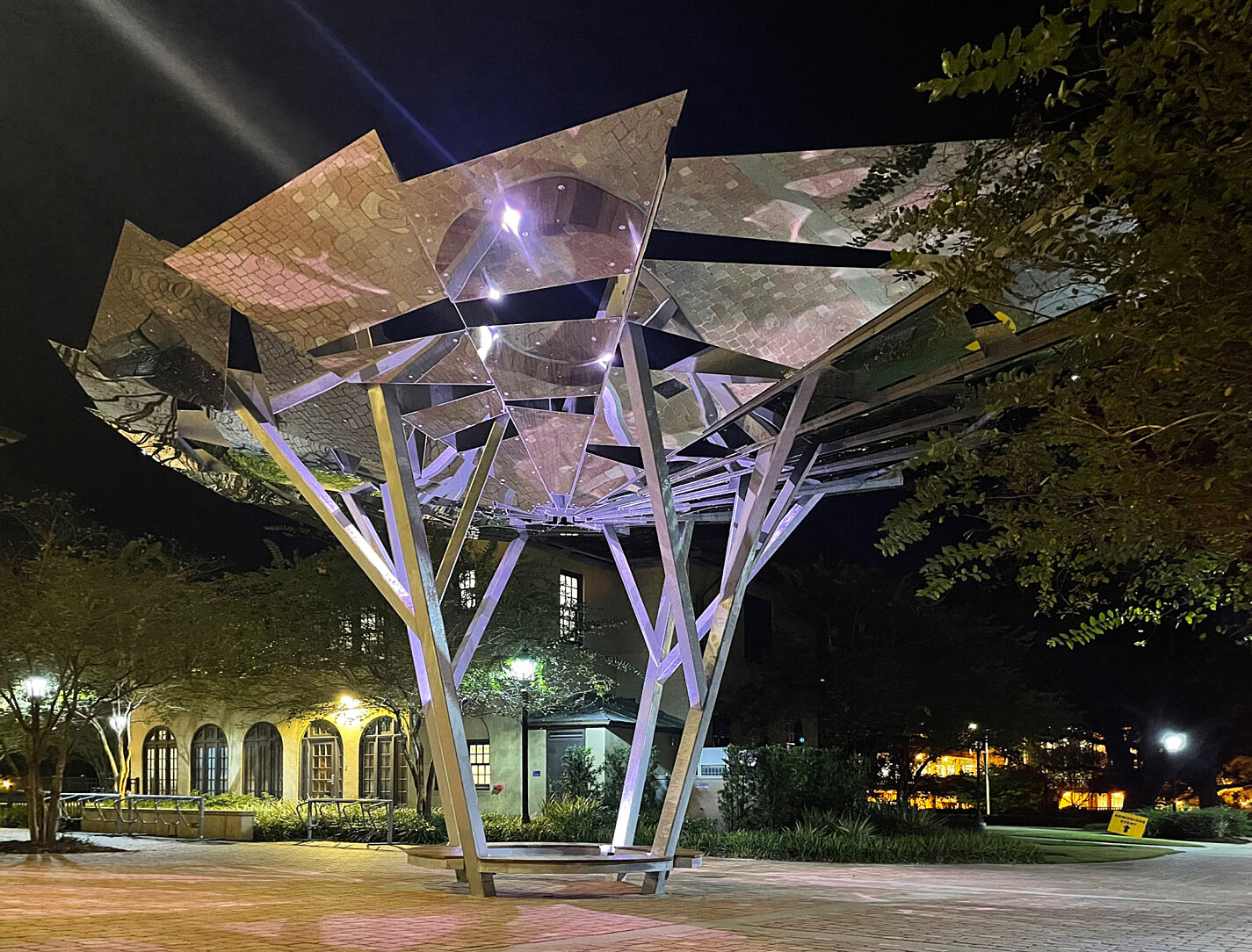Commissioned through the Percent for Arts program, Reflectivity is consistent with the university’s commitment to the generation, preservation, dissemination, and application of knowledge and cultivation of the arts. Reflectivity is composed of 20 mirror-finished stainless steel panels held aloft by four hot-dip galvanized steel “trees.” The hot-dip galvanized steel tree branches pass through round cutouts in the stainless steel canopy. Each branch supports a spoke in the beam structure above. A circular wooden bend underneath provides a place to sit in the shade.
