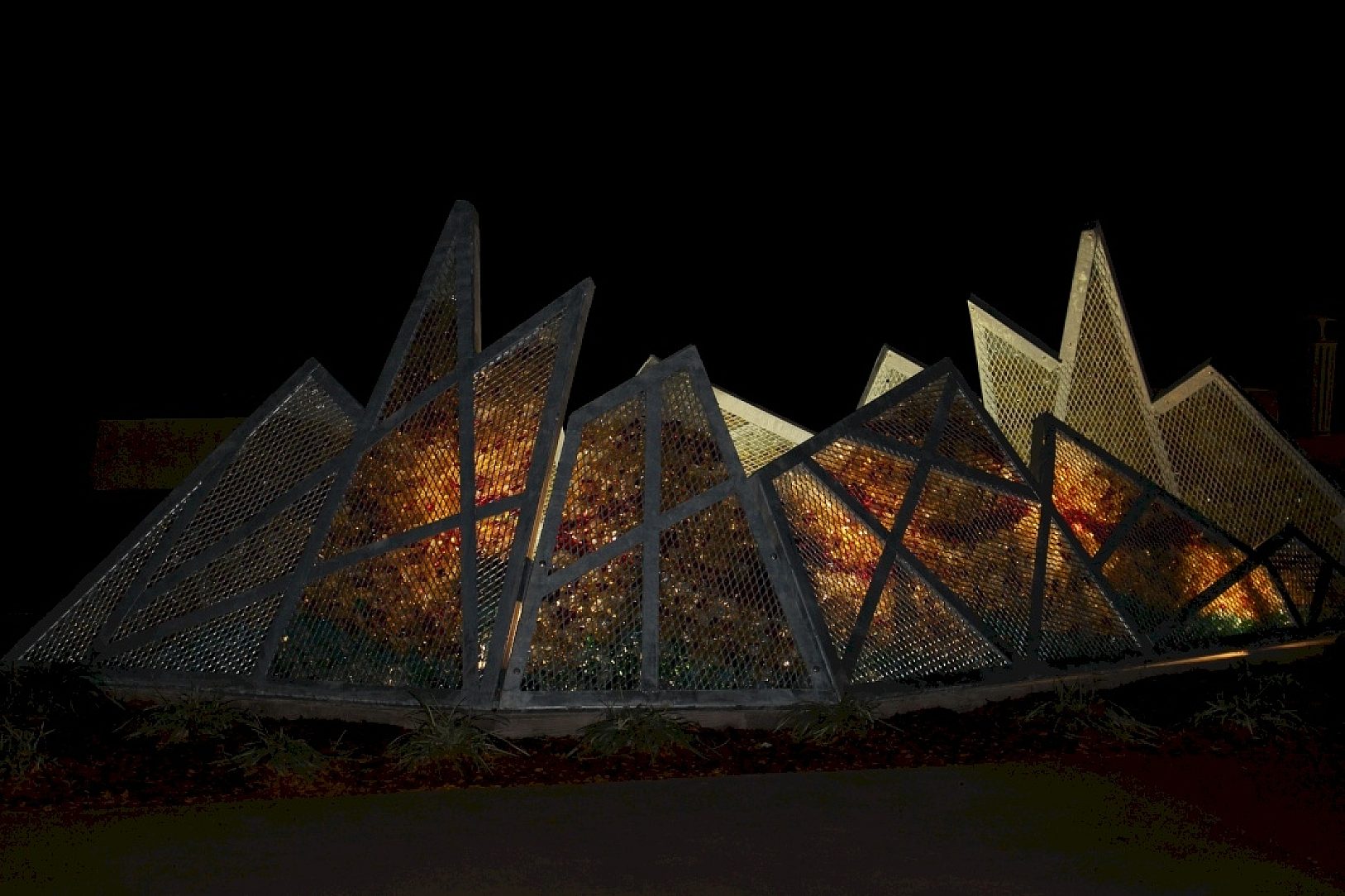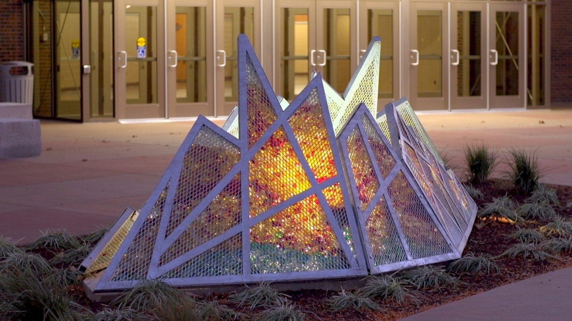 We find that symbolic connection between rebirth of the regional prairie and the Salina Bicentennial Arena for the local community. The people that enter the arena can have a magically abstracted experience of the blazing prairie through the illumination of this colored glass filled with a series of jagged steel panels. Although this wall of fire is static in nature, it is imbued with a warmth and energy that seems catalytic and kinetic in nature.