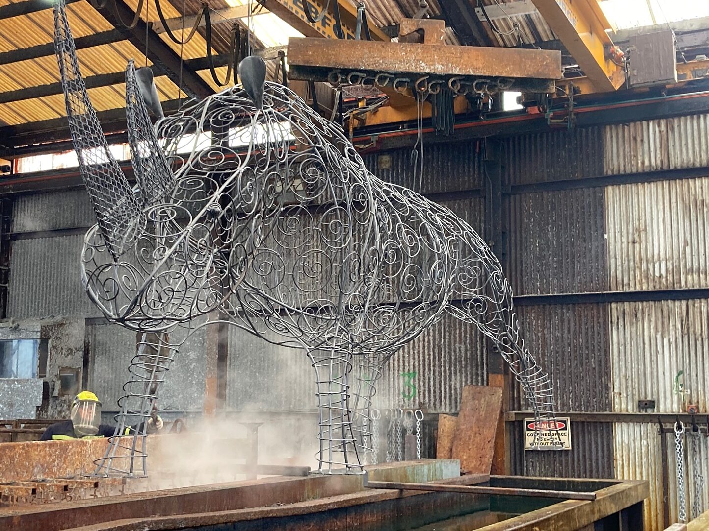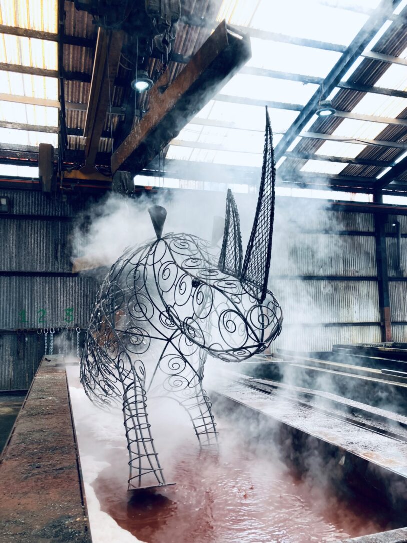 With many different methods to choose from, hot-dip galvanizing was a differentiator for the project because of its strength, durability and aesthetic appeal. It was proven to be the best method compared to other options because of the desired color to resemble a white rhinoceros as well as its flexibility to craft intricate designs along its body. To achieve the desired color, the entire .3T white rhinoceros was hot-dip galvanized, requiring the team to communicate throughout the process to ensure there was no damage to the delicate structure.