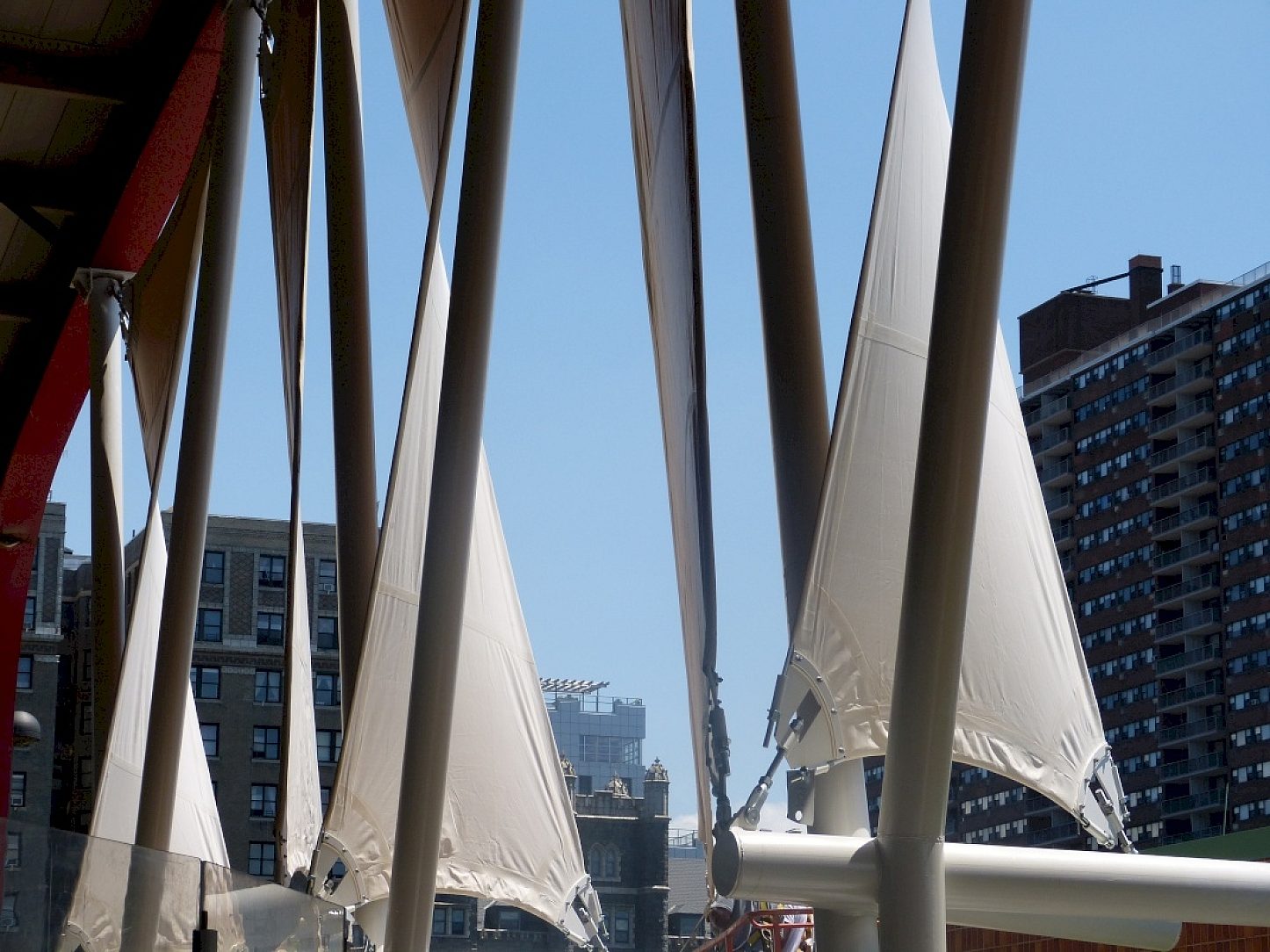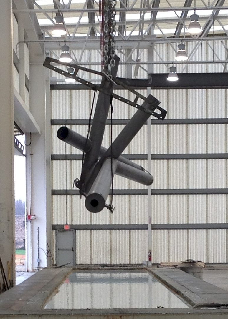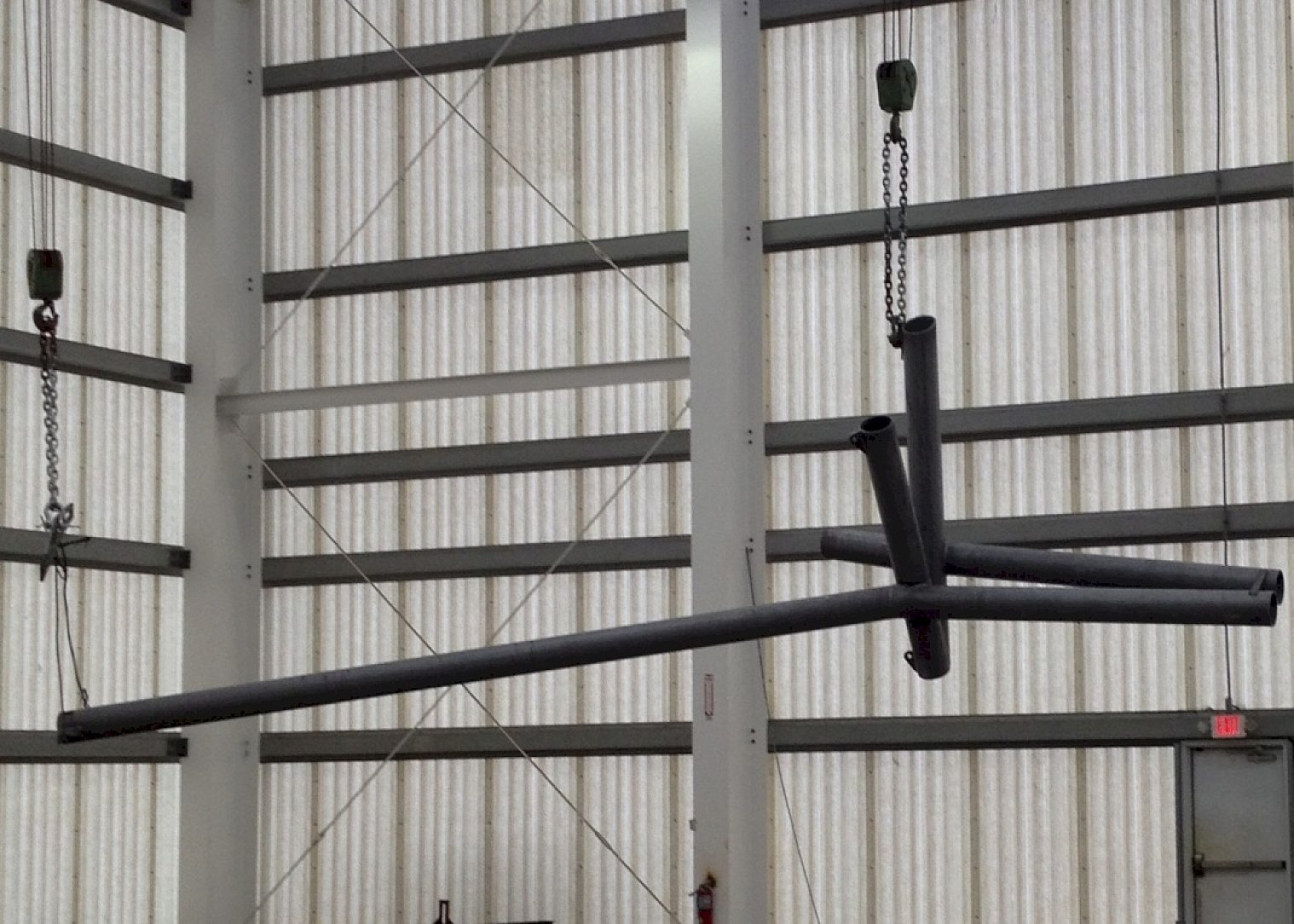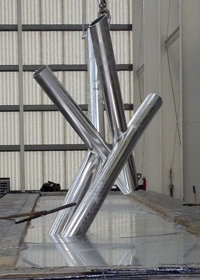 The "Y" Columns were used to resemble a ships mast and boom once a white screen was attached after installation. The "Y" Columns posed some challenges since the fabrication was nearing the kettle limits in size. Lifting lugs were attached in strategic locations in order to get the correct pitch and angle when coming out of the zinc bath. It was imperative the final appearance after the column was removed out of the zinc bath provided a smooth and uniform finish that would be suitable for painting over.