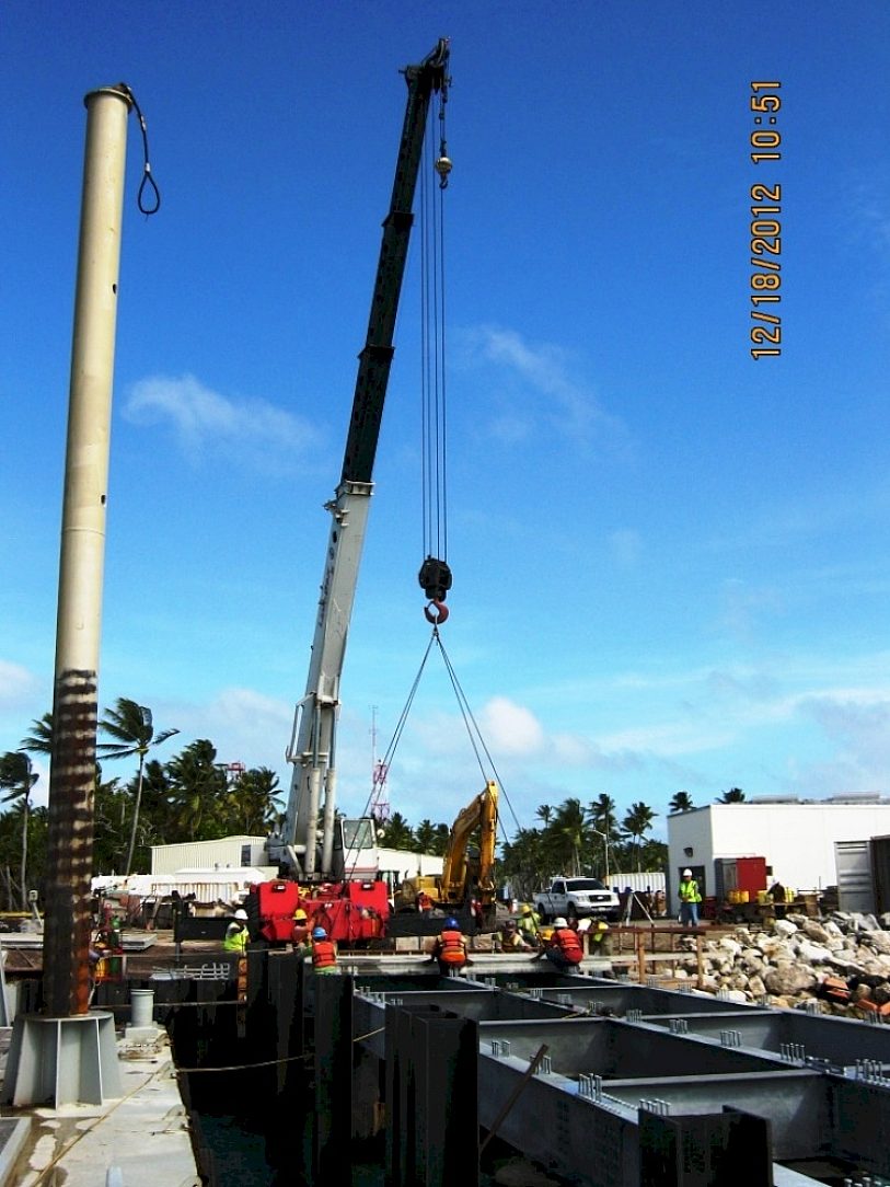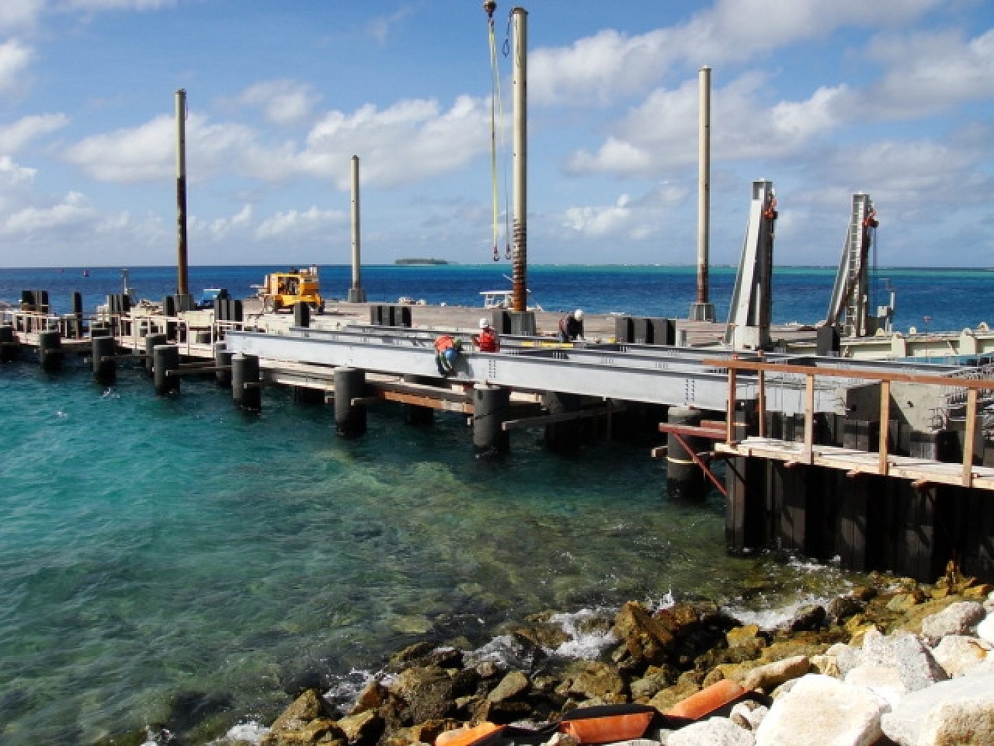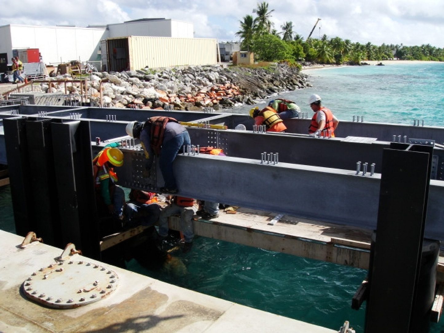 The Roi-Namur Fuel Pier plays an integral role at the U.S. Army Kwajalein Atoll/Ronald Reagan Ballistic Missile Defense Test Site Facilities located in the Republic of the Marshall Islands. Constructed in the early 1960s, the fuel pier originally had a 15-ton truckload capacity. Subject to the harsh marine environment of the atoll, over the years, the original steel pier suffered significant deterioration and its operational capacity was eventually downgraded to allow only foot traffic. Since the late 1990s, the pier could only be used to berth vessels along its west side with all off-loading of fuel and supplies occurring across the head-end of vessels (typically landing craft and barges) at an adjoining steel sheet pile bulkhead.