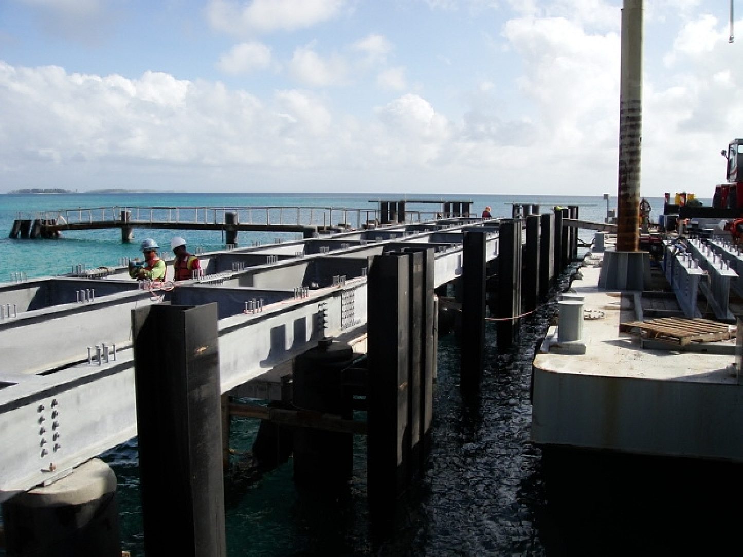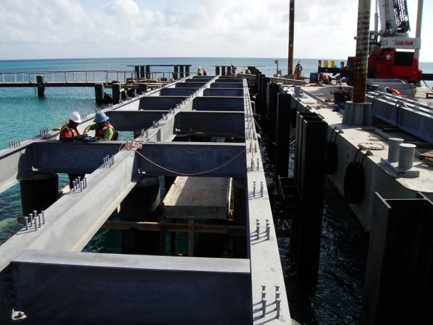 Reusing the piling created additional constraints and challenges to the project. Furthermore, because of the inherent difficulties of on-site fabrication, the goal was to make optimum use of prefabricated elements to enhance constructability. The concept was to design the structure with a building blocks mentality to facilitate the potential construction by the U.S. Navy Seabees. To help accomplish this, there was the specific requirement that the entire galvanized system be fully assembled in the plant before shipment on a mock-up of the in-place piling arrangement to ensure a proper fit could be achieved on the island. The superstructure beams were also to have shear studs installed before shipping with the studs properly positioned for pockets in the deck panels that would later be grouted to promote composite action for the concrete deck and steel superstructure system.