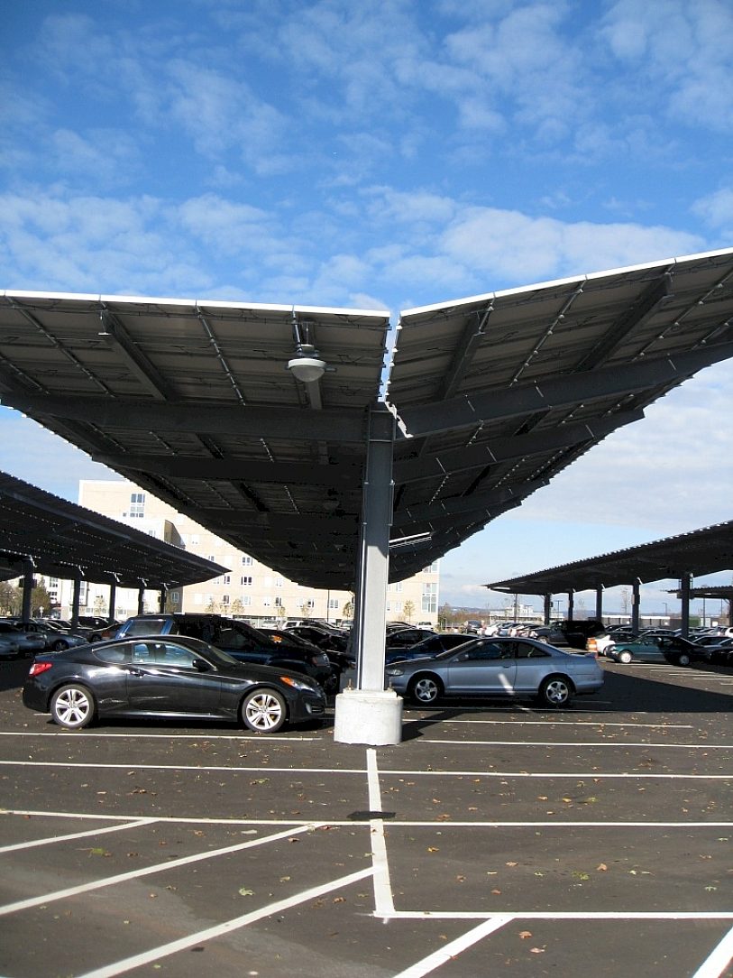 The project consists of nearly 3 miles of 40' wide elevated solar parking canopies, generating a peak electrical output of over 8 megawatts. Given that the project represents a significant commitment to sustainability, galvanizing was the obvious choice over a three part paint system after the facts were presented. Galvanizing was able to beat the original delivery time by over 6 weeks on the 3.5 million pound project.