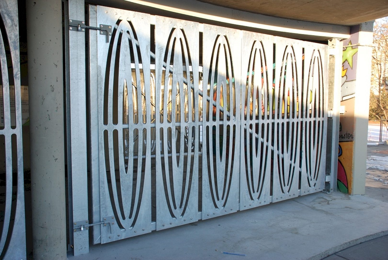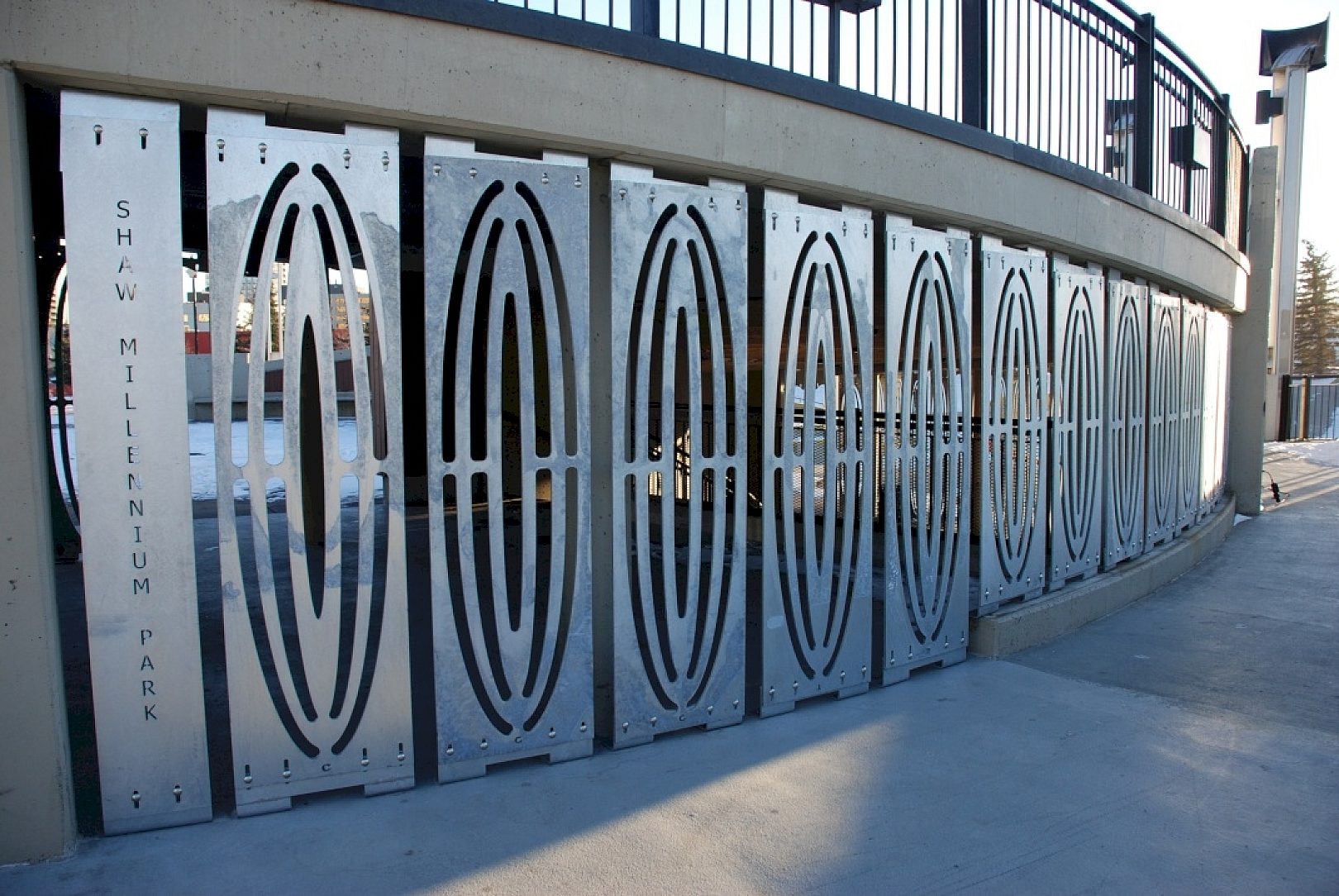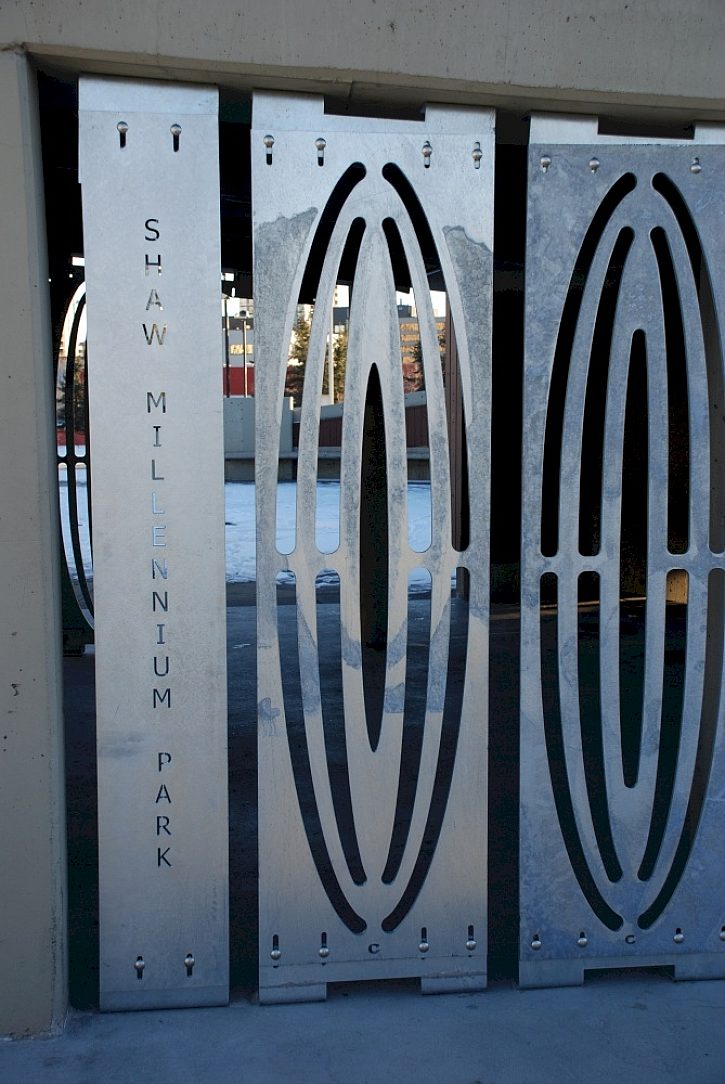 The City of Calgary played with the idea of painted bars underneath the stairs, but quickly dismissed it once they realized it would make the park look off limits and would forever restrict access to the area underneath the stairs. The City of Calgarys Fabrication & Welding Shop then came up with the idea of artistic wall panels that looked less restricting and more like an art installation. It was the same cost as installing painted bars without the maintenance required that comes with painted structures, so they immediately began working on the design internally.