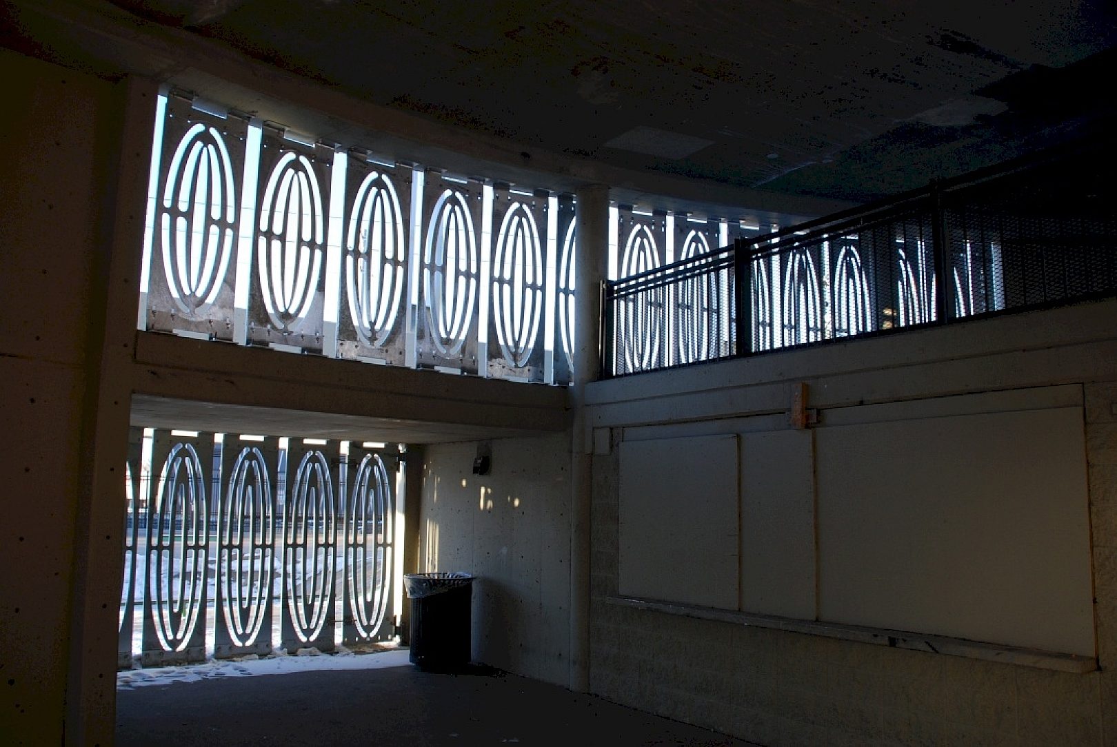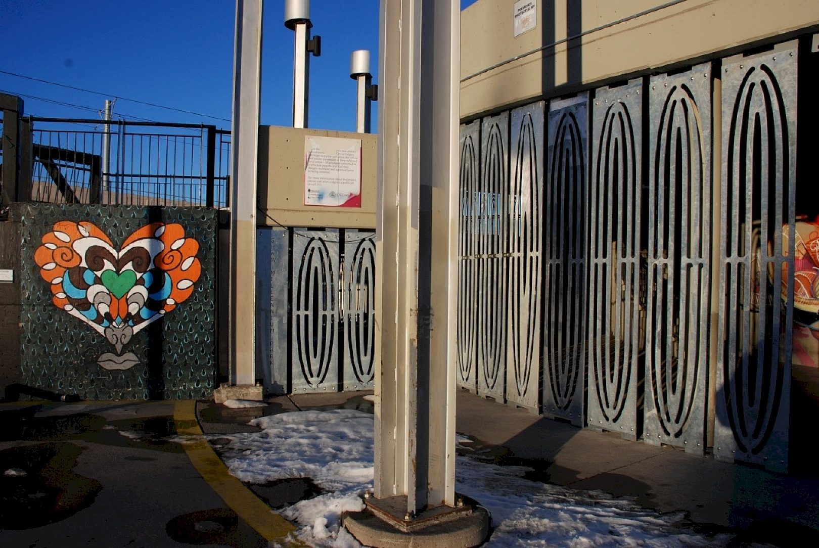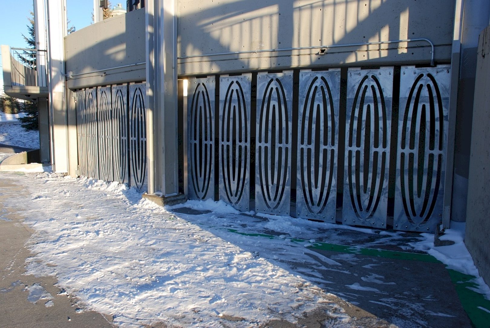 The City of Calgary played with the idea of painted bars underneath the stairs, but quickly dismissed it once they realized it would make the park look off limits and would forever restrict access to the area underneath the stairs. The City of Calgarys Fabrication & Welding Shop then came up with the idea of artistic wall panels that looked less restricting and more like an art installation. It was the same cost as installing painted bars without the maintenance required that comes with painted structures, so they immediately began working on the design internally.