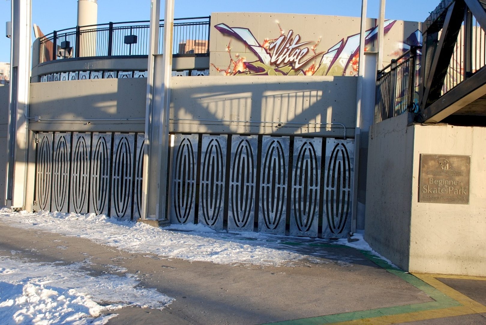 Amongst its 88,000 square feet you will find an area which contains a set of spiral stairs that transitions the upper part of the park to the lower bowls. Unfortunately, with a large secluded section underneath the main structure, a less than desirable crowd was attracted after hours and an increase of criminal activity in the park was observed. Because of this, the city came up with a plan to install a set of wall panels that closed and locked off the section without making the area look off limits. This allowed the skateboard portion of the park to remain open 24 hours in lieu of shutting down with the remainder of the park at 11pm. It also allowed the area to be opened up if needed when large venue functions were taking place.