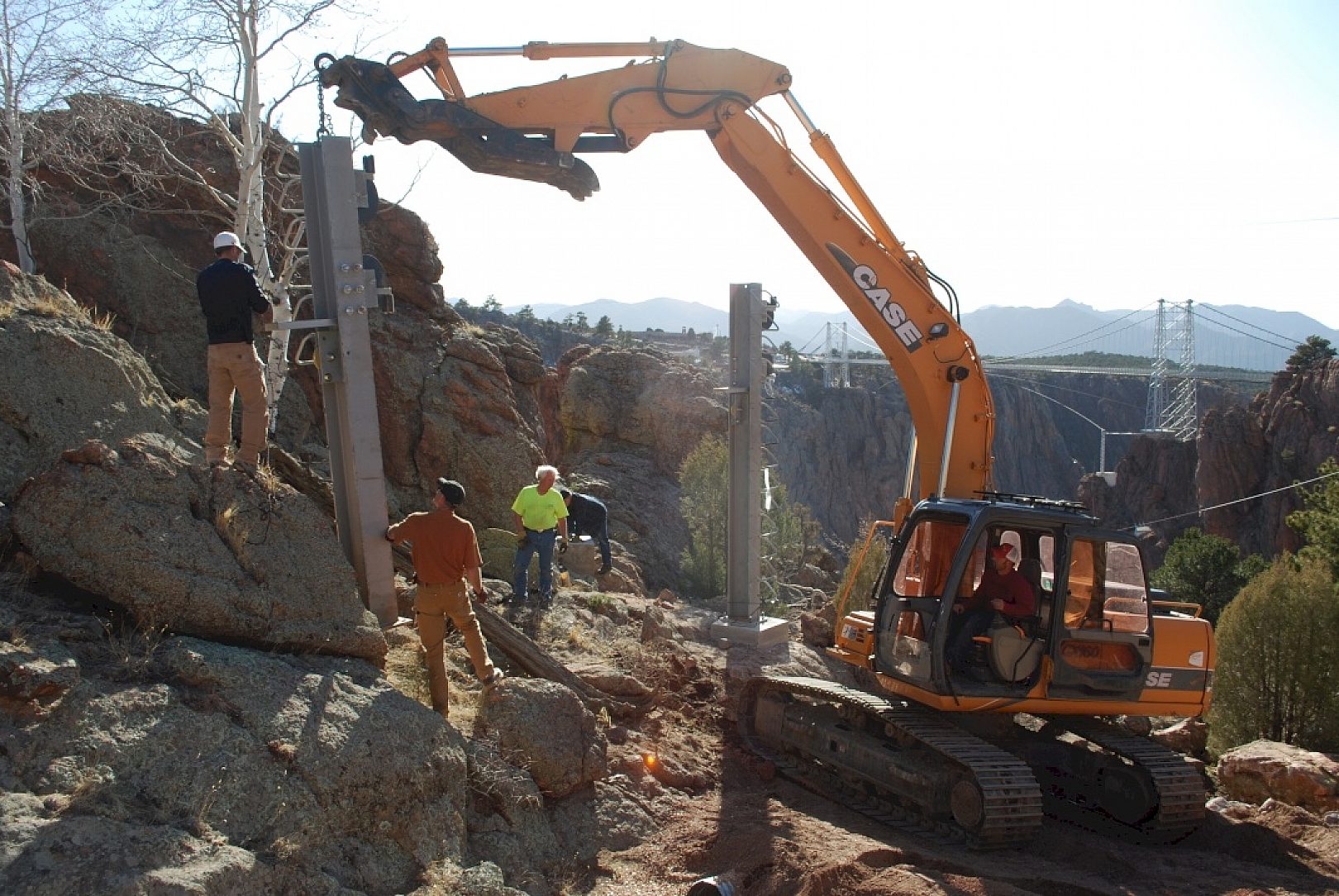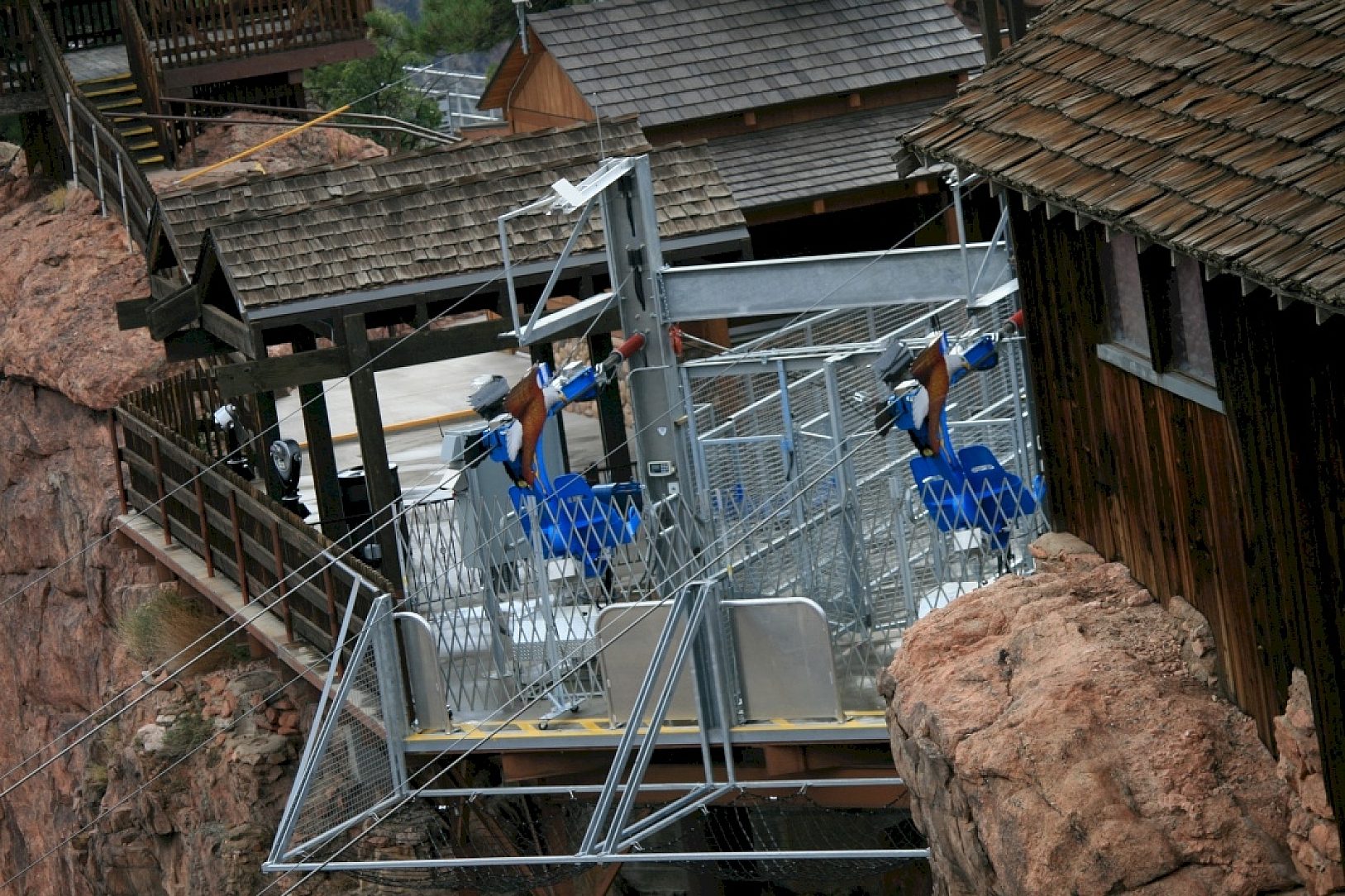 It is located in the 360 acre theme park along with 21 other rides, shows, and attractions. The park is a popular natural attraction in Colorado, boasting of bringing together the scenic beauty of the Grand Canyon and the human achievement of the Golden Gate Bridge. The Soaring Eagle Zip Lines location is perched on a 1,000 foot granite canyon wall, which makes it difficult, dangerous, and expensive to maintain a painted surface.
