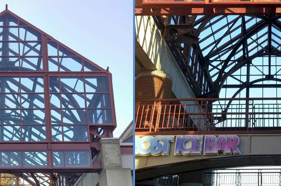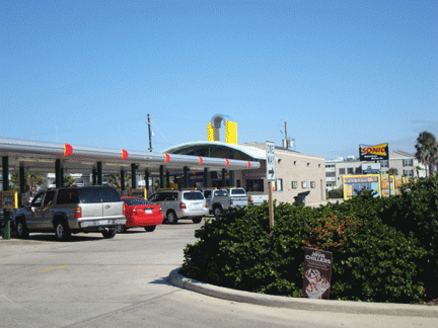 The car canopy at this Sonic fast food drive-in is a staple of American culture. Their signature "carport" look was recently updated in Galveston, Texas, located directly on the coast of the Gulf of Mexico. Due to its close proximity to the ocean, the structure had to be repainted almost yearly because of the salt and sea spray corroding the steel.