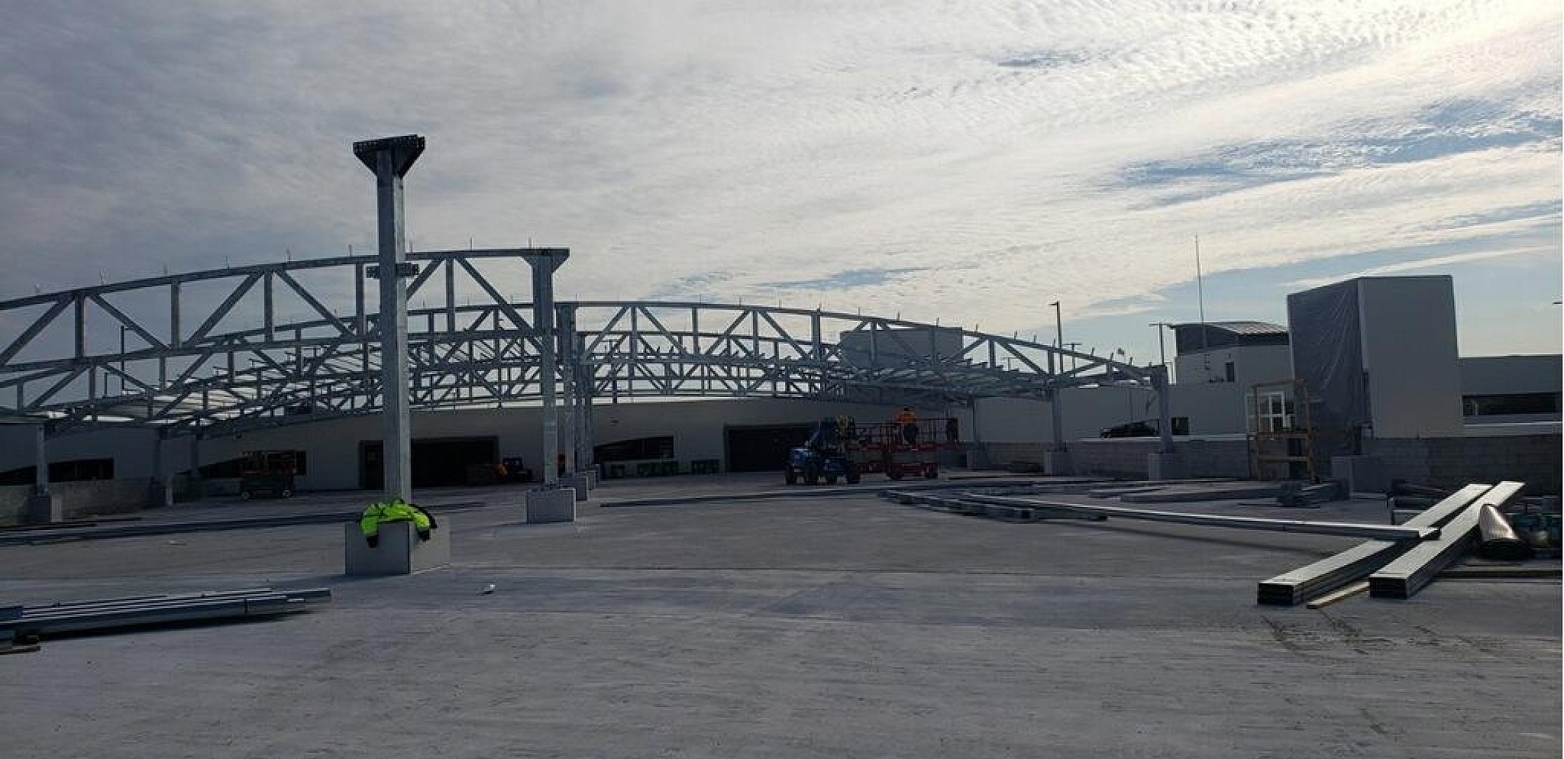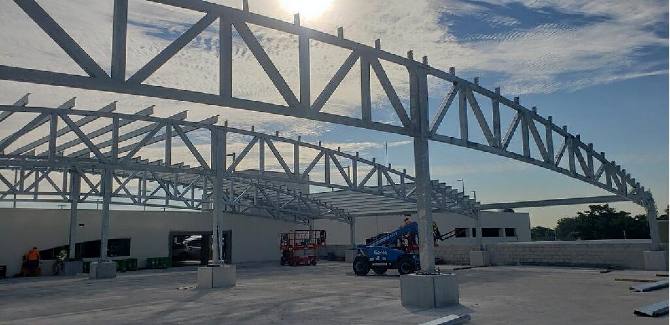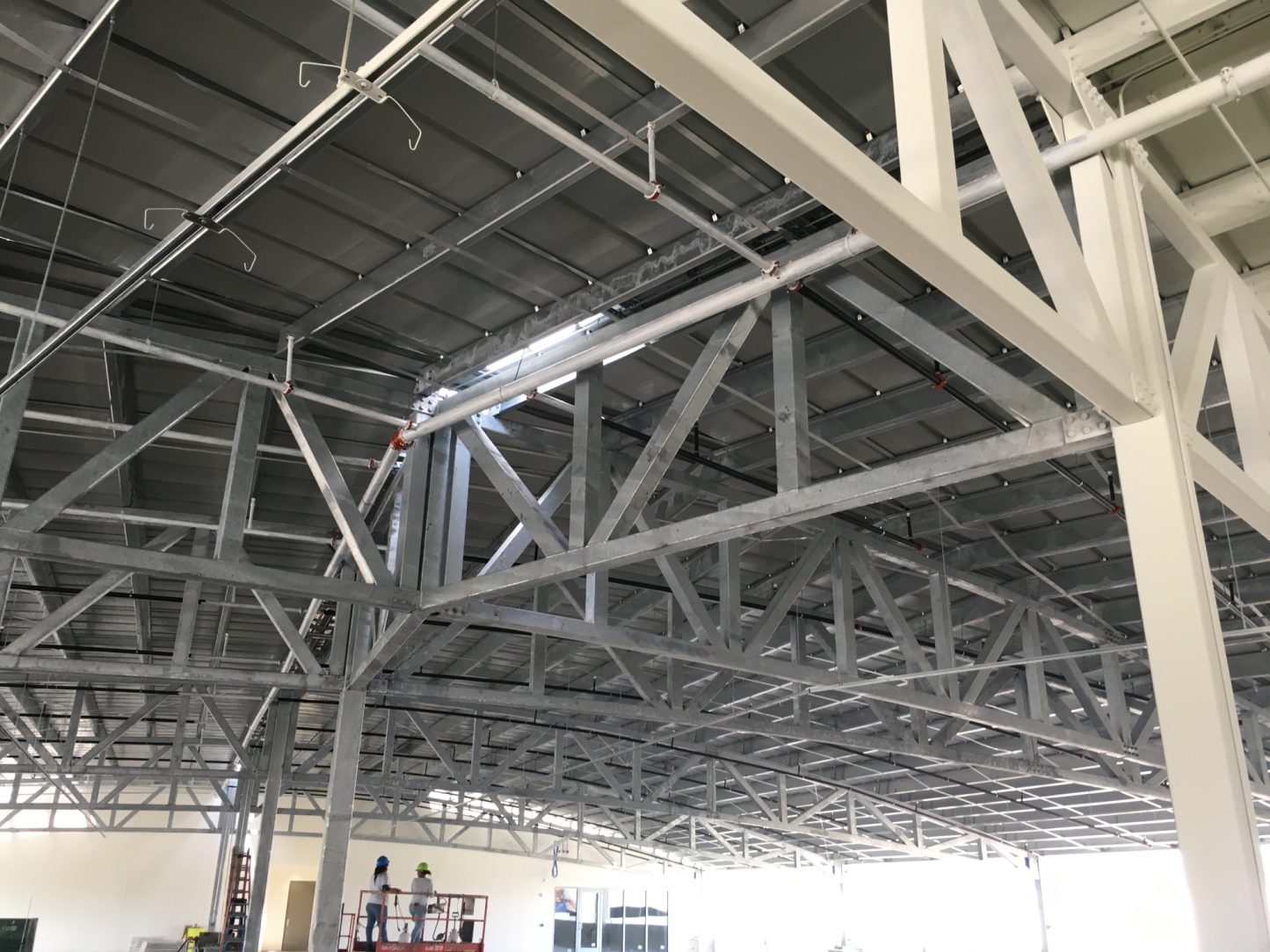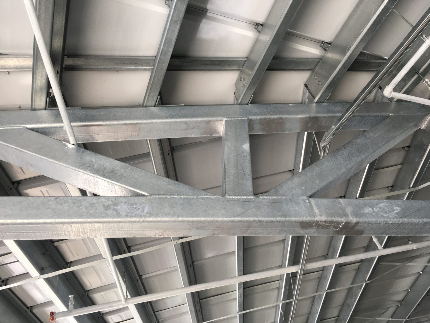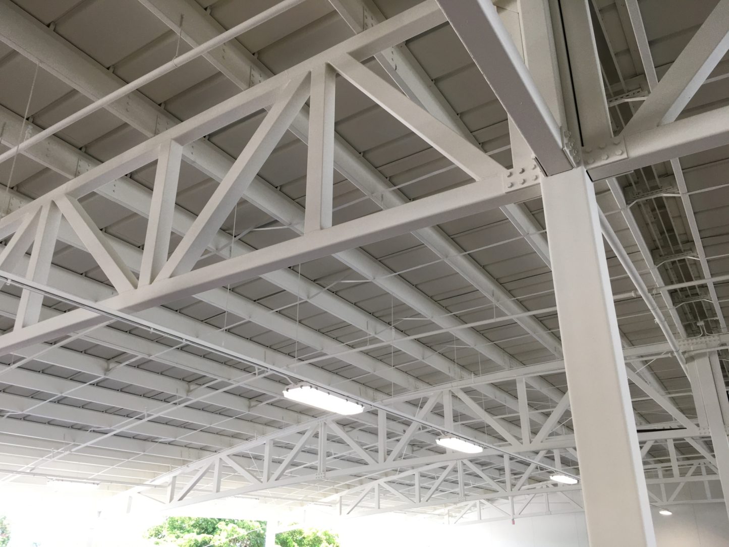 The canopy is open to the elements along the two low eaves, which exposes multiple structural components to the outdoor environment. After hot-dip galvanizing, the structure received a finished coat of paint to provide further protection and white appearance.